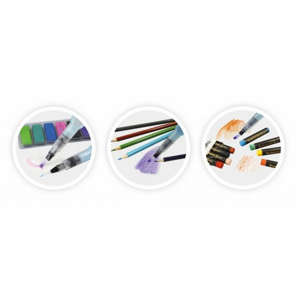 Der følger 2 genopfyldelige vandpensler med som dit barn kan bruge sammen med både farvelade, akvarelblyanterne og oliepastellerne.