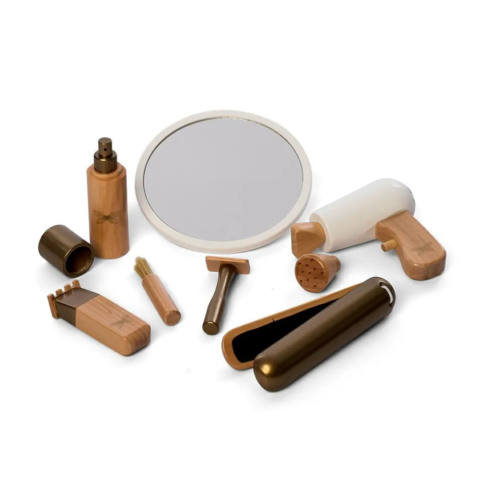 Meget fint frisørsæt fremstillet af træ med en fin opbevaringspose med bindebånd til.