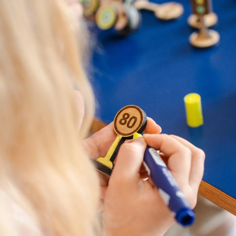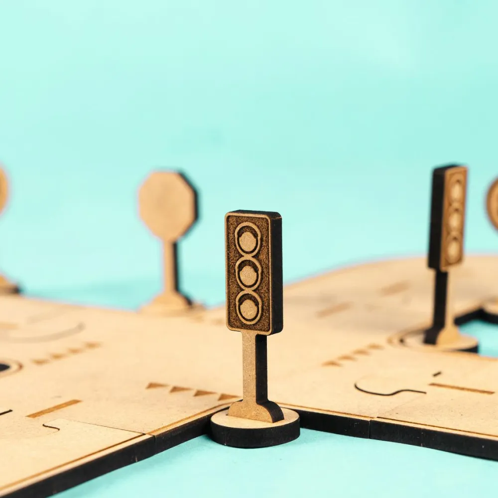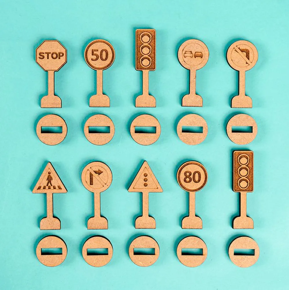 Danskproduceret trælegetøj, der kan bruges sammen med vores Crateit Town-sæt eller med hvad dit barn allerede har af vejbaner eller bymiljø, så I kan øve reglerne i trafikken. Måske kender dit barn allerede nogle af skiltene fra jeres ture med bil eller bus?