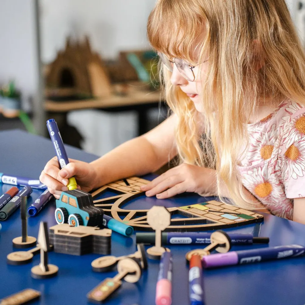 Af ufarvet træ som dit barn selv kan farvelægge med tusser, maling eller farveblyanter.