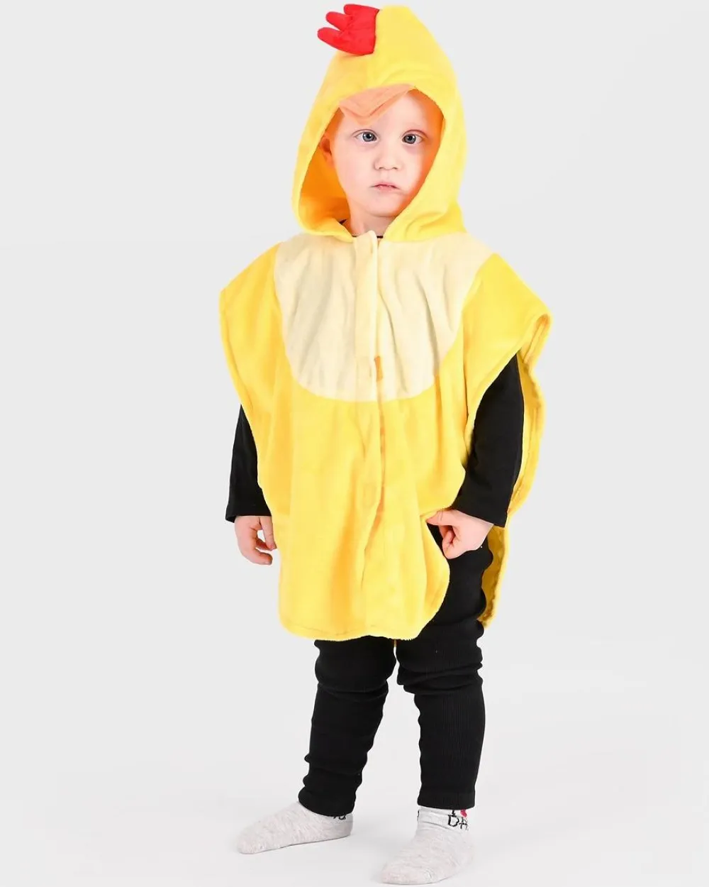 Med denne behagelige kappe, der lukkes foran og har hætte, kan dit barn nemt blive kylling for en dag. Måske for en uges tid eller to, hvis det bliver den nye yndlingsleg.