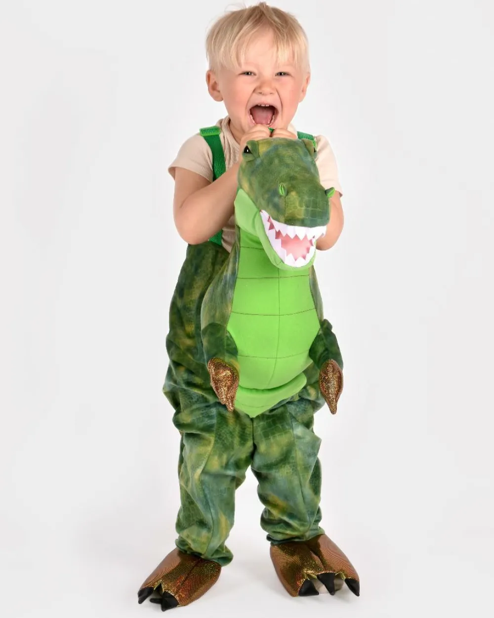 Kan man ride på en dino? Jeps, det kan man godt. Her er et flot ride-on kostume med flotte, gyldne kløer.
