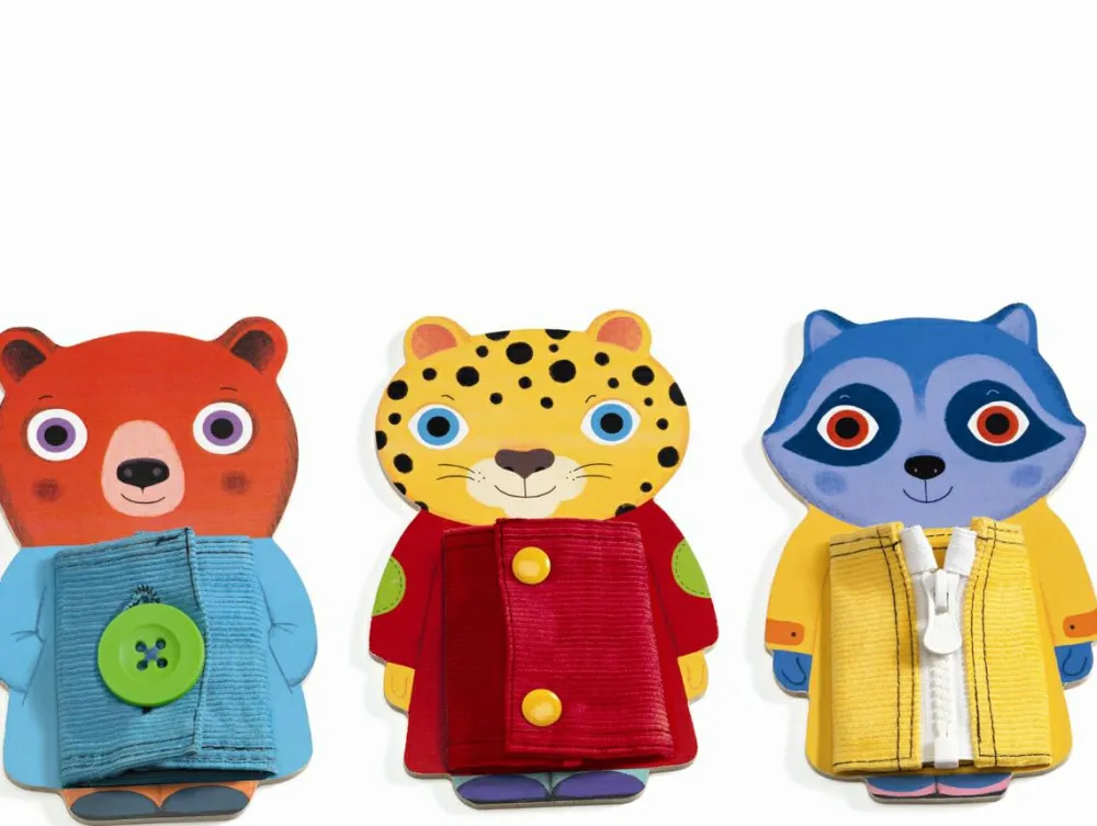 De 3 søde dyr af træ skal have dit barns hjælp til at åbne og lukke deres jakker – og det giver en fin mulighed for at træne finmotorikken for dit barn.