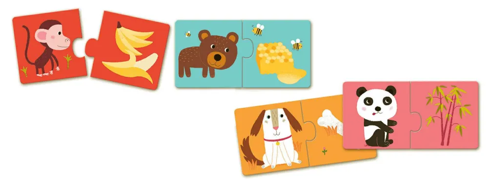 I dette søde læringspuslespil er der 20 brikker i alt, der skal parres til i alt 10 små puslespil, der handler om dyr og deres kost.