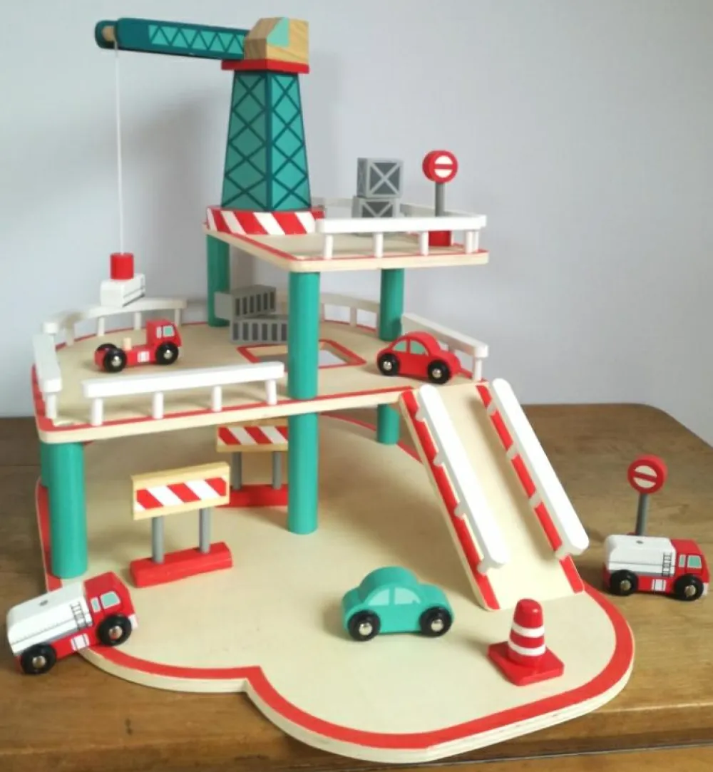 Dit barn kan flytte rundt på containerne med kranen og køre 3 trucks rundt med de tonstunge containere, der måske indeholder løbecykler og kuglebaner?