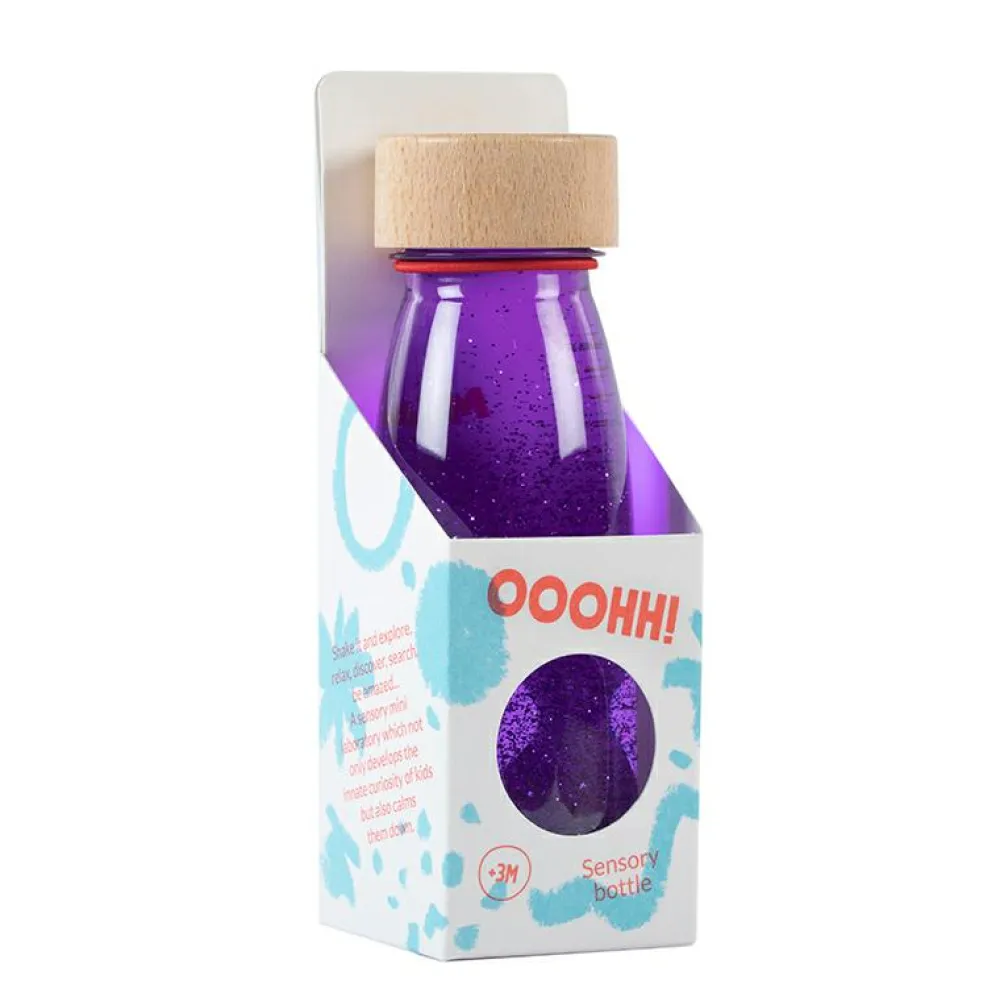 Fald til ro og tag en pause med at vende og dreje flasken og se det lilla glitter og pomponer glide og boble rundt derinde.