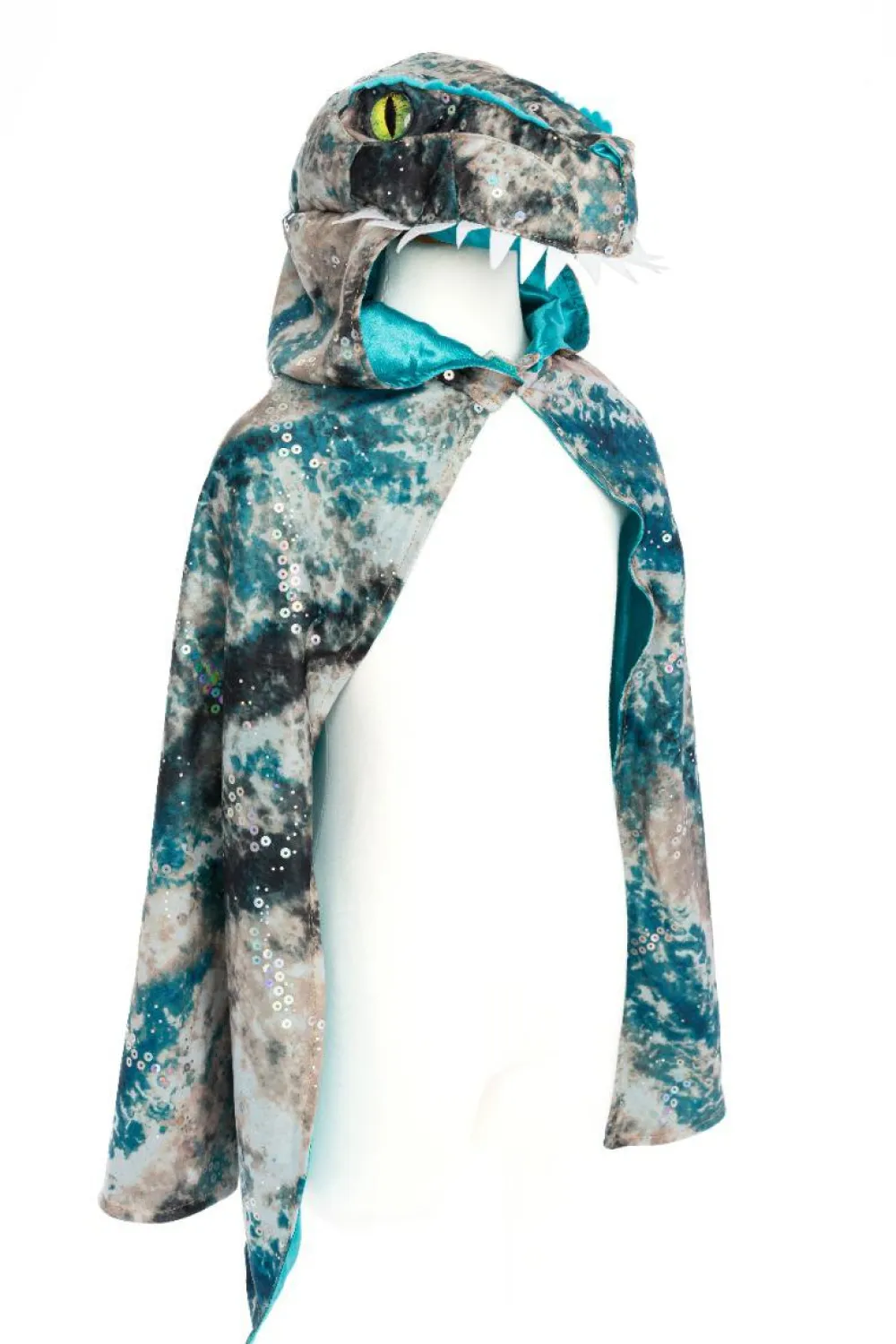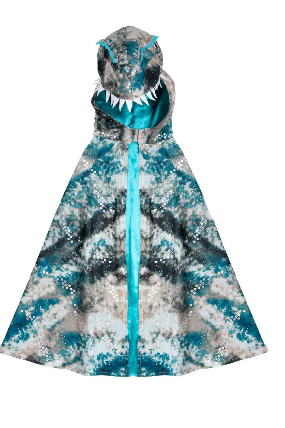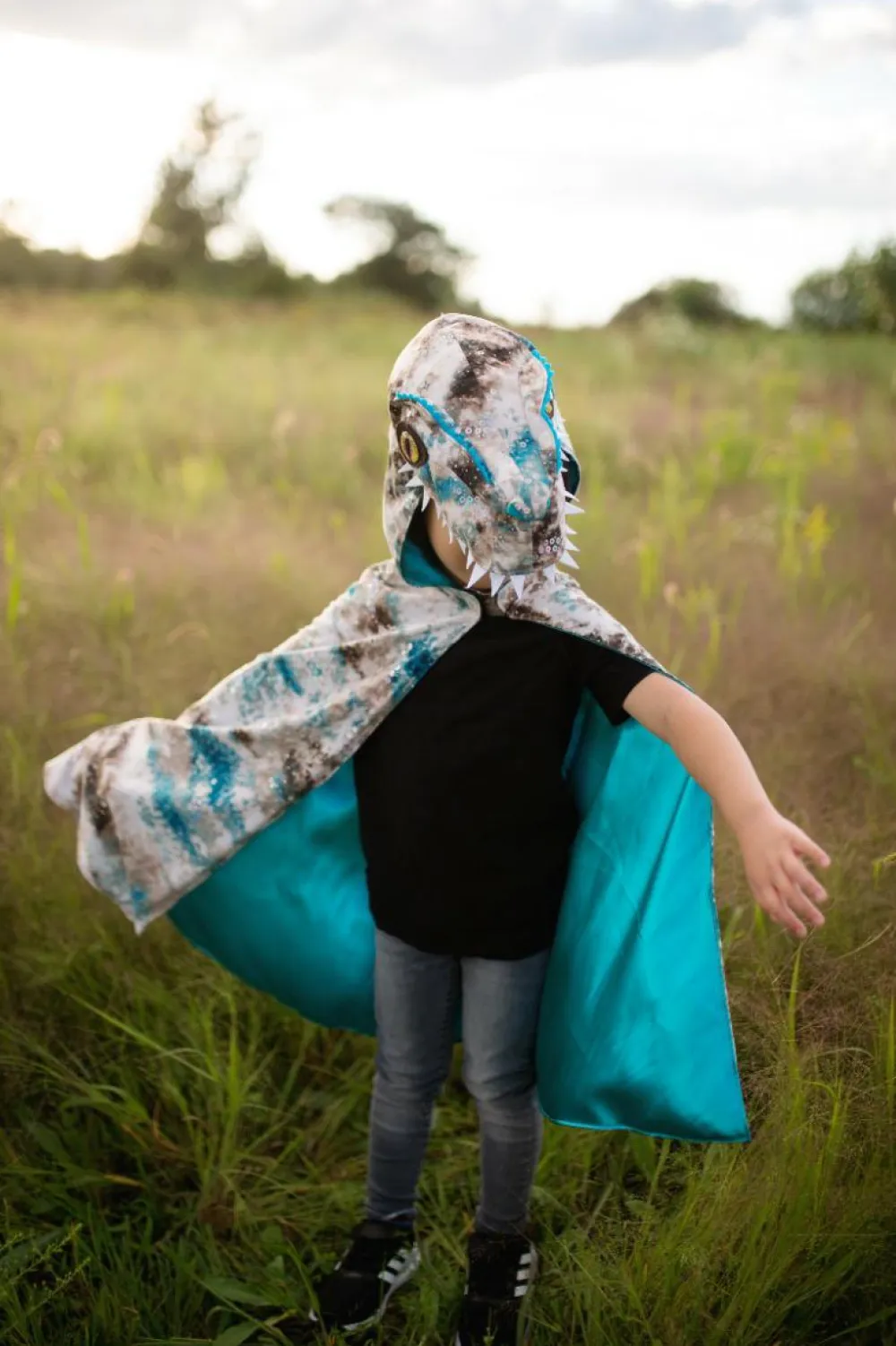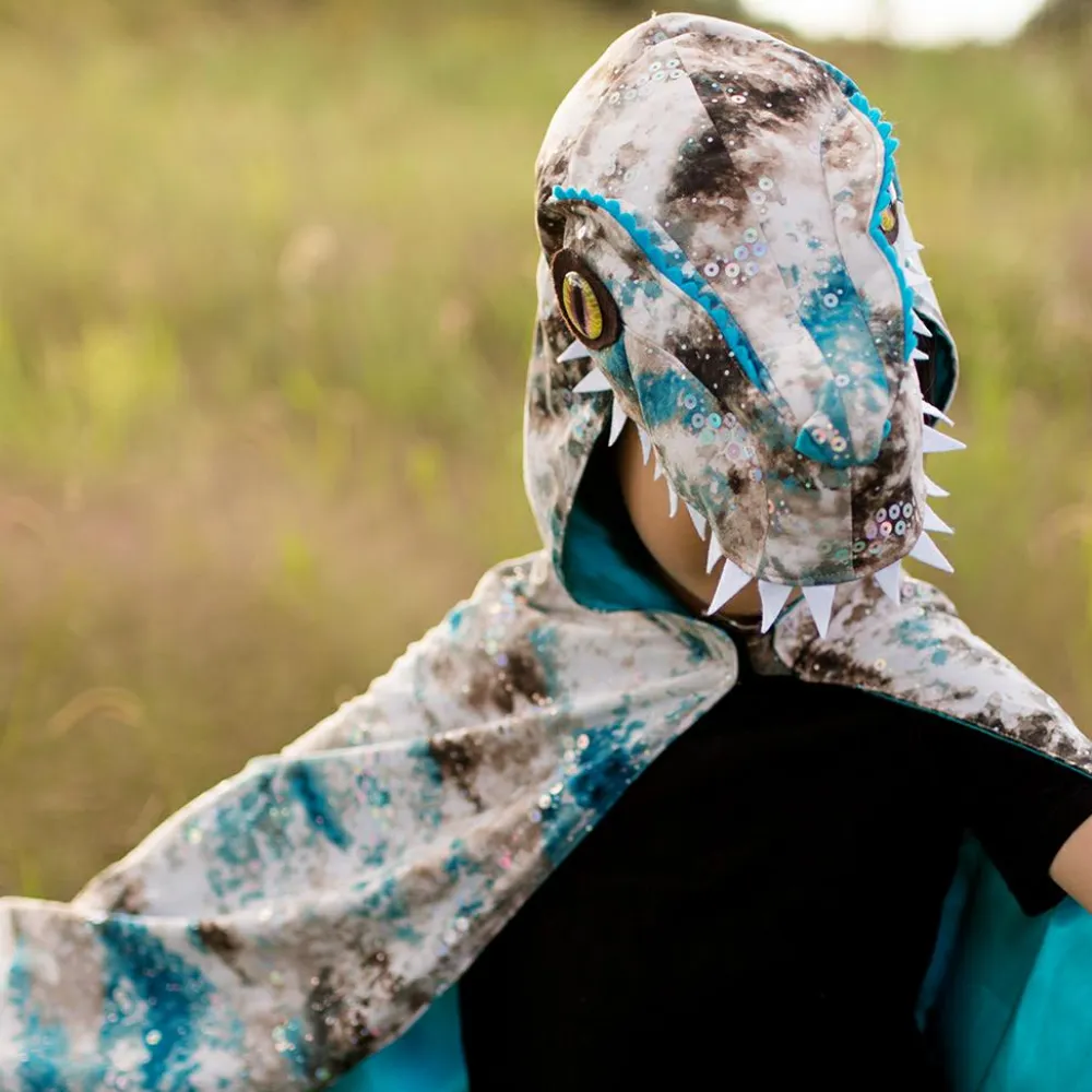 Wow hvor er den flot med de livagtige øjne og lækre detaljer med mønstre og pailetter i kappen, god pasform og nem lukning under hagen. Så kan dit barn selv kan tage kappen på og suse ud på løbehjulet – som Velociraptorer jo elsker at gøre.