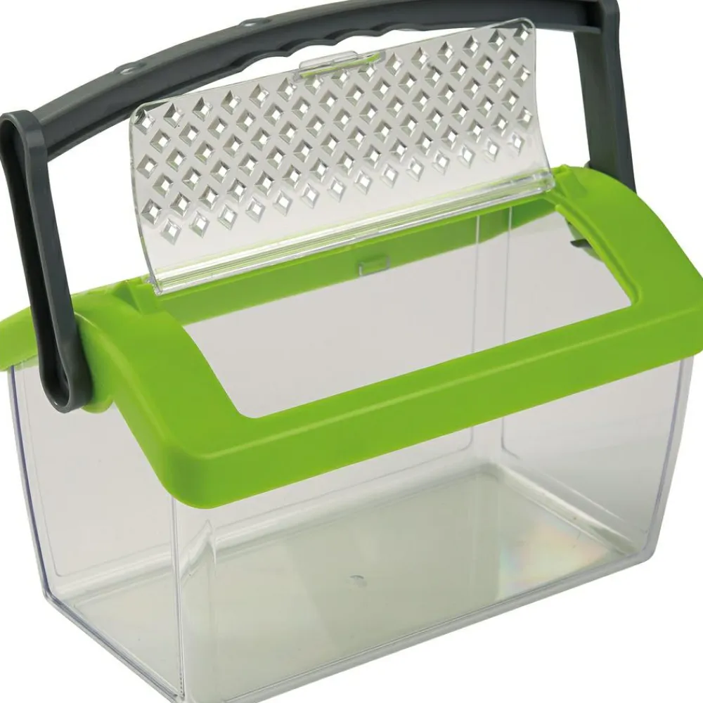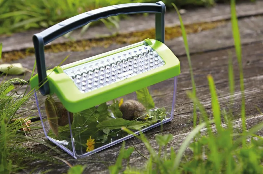 En stor, solid insektboks af plastik med et håndtag, der er rart at holde i.