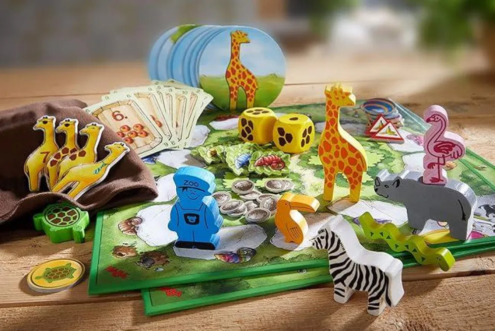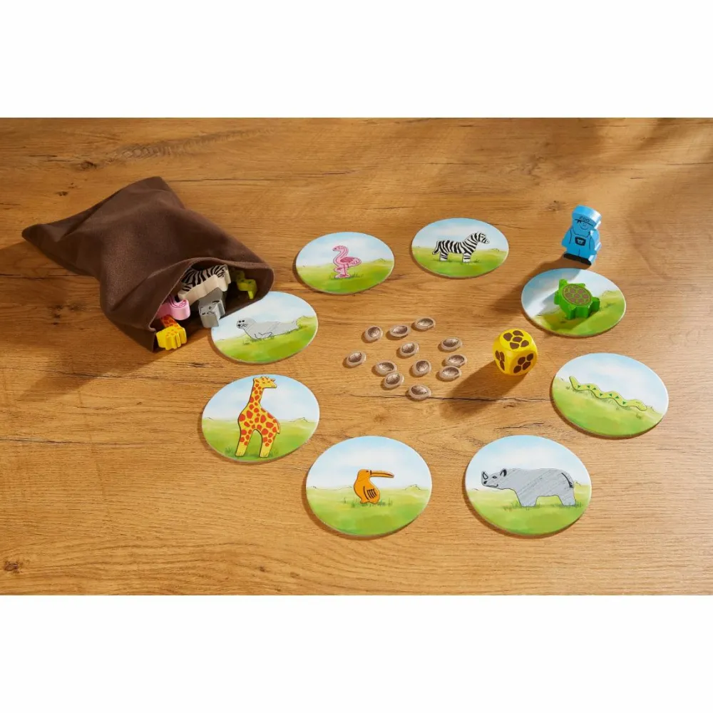 En virkelig herlig samling af spillebrikker, plader og andre redskaber med dyretema, som du og dit barn kan spille 10 forskellige spil med.