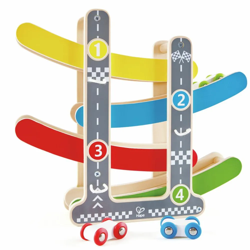 En sej bilbane af træ med 3 biler til. Bilerne triller ikke bare ned ad banen, de slår kolbøtter for enden af hver etage.