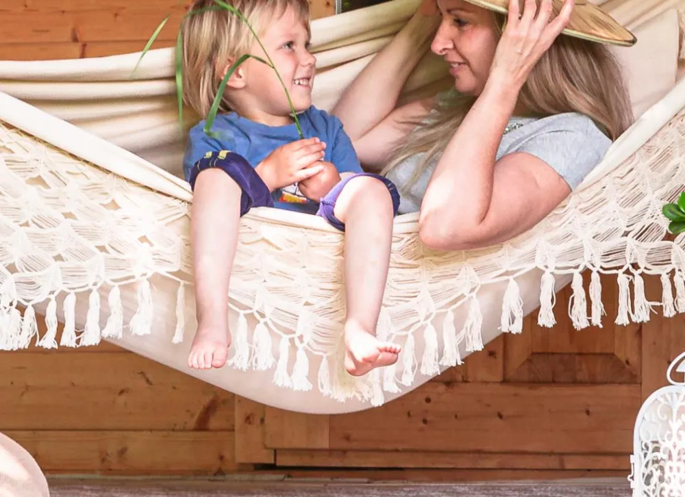Aah at ligge og gynge frem og tilbage. Det er altså lækkert. Og med denne hængekøje kan I være flere, der slapper af sammen.