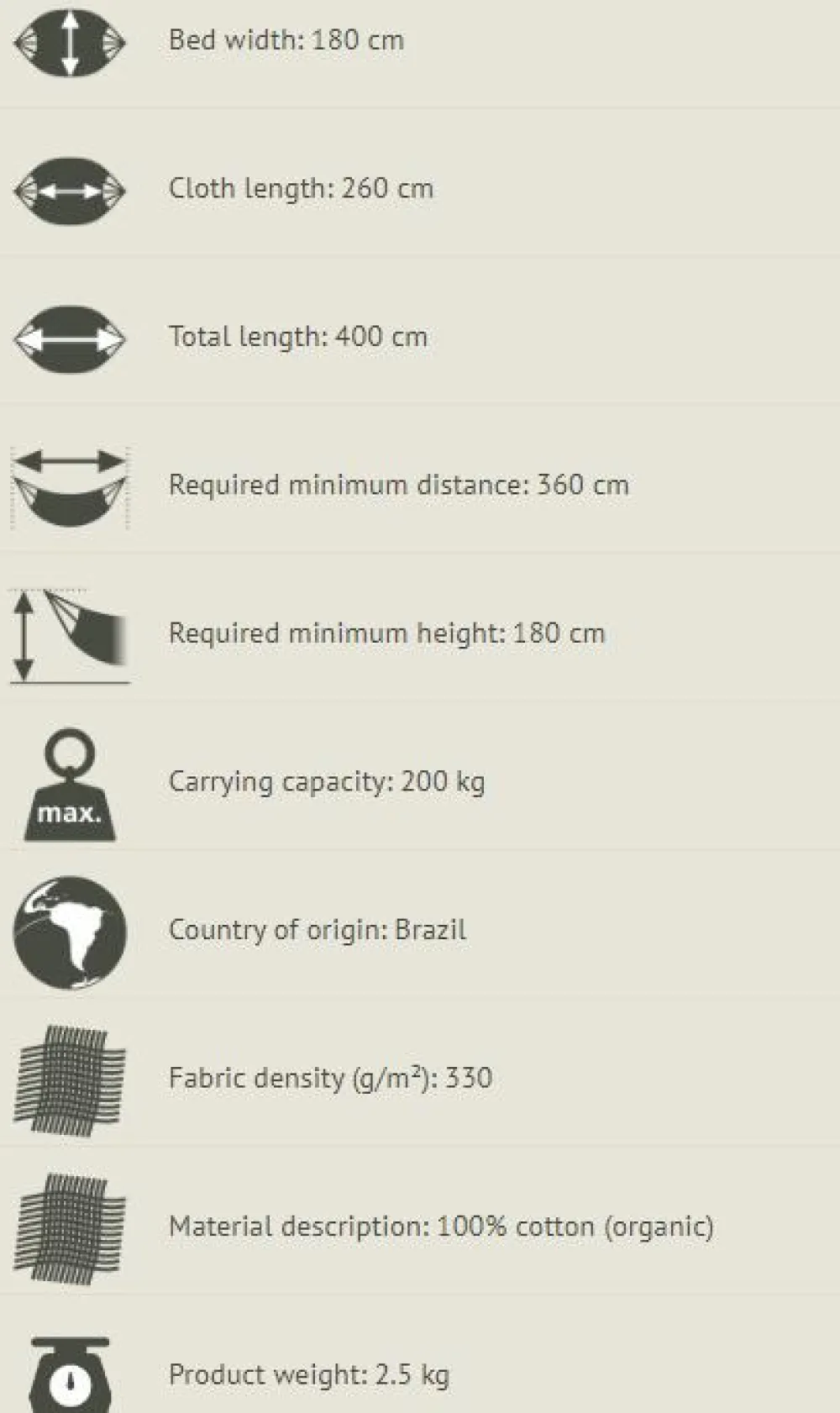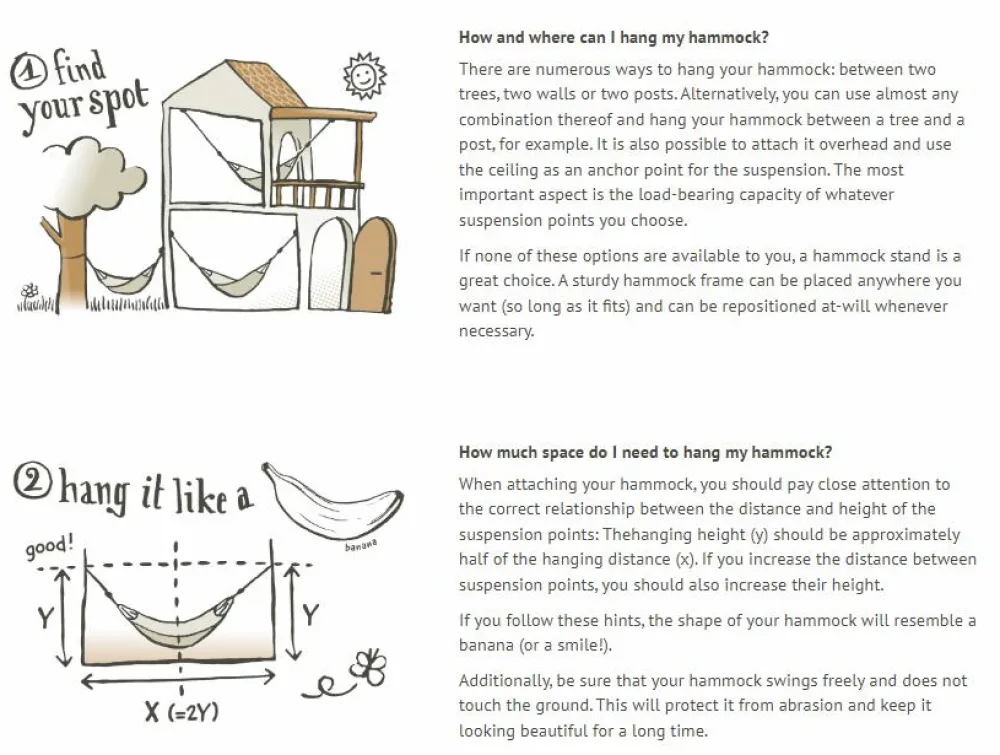 Hængekøjen er håndlavet i Brasilien under ordentlige arbejdsforhold. Det giver ekstra god mavefornemmelse, når du ligger og daser, tager en lur eller læser højt i hængekøjen.