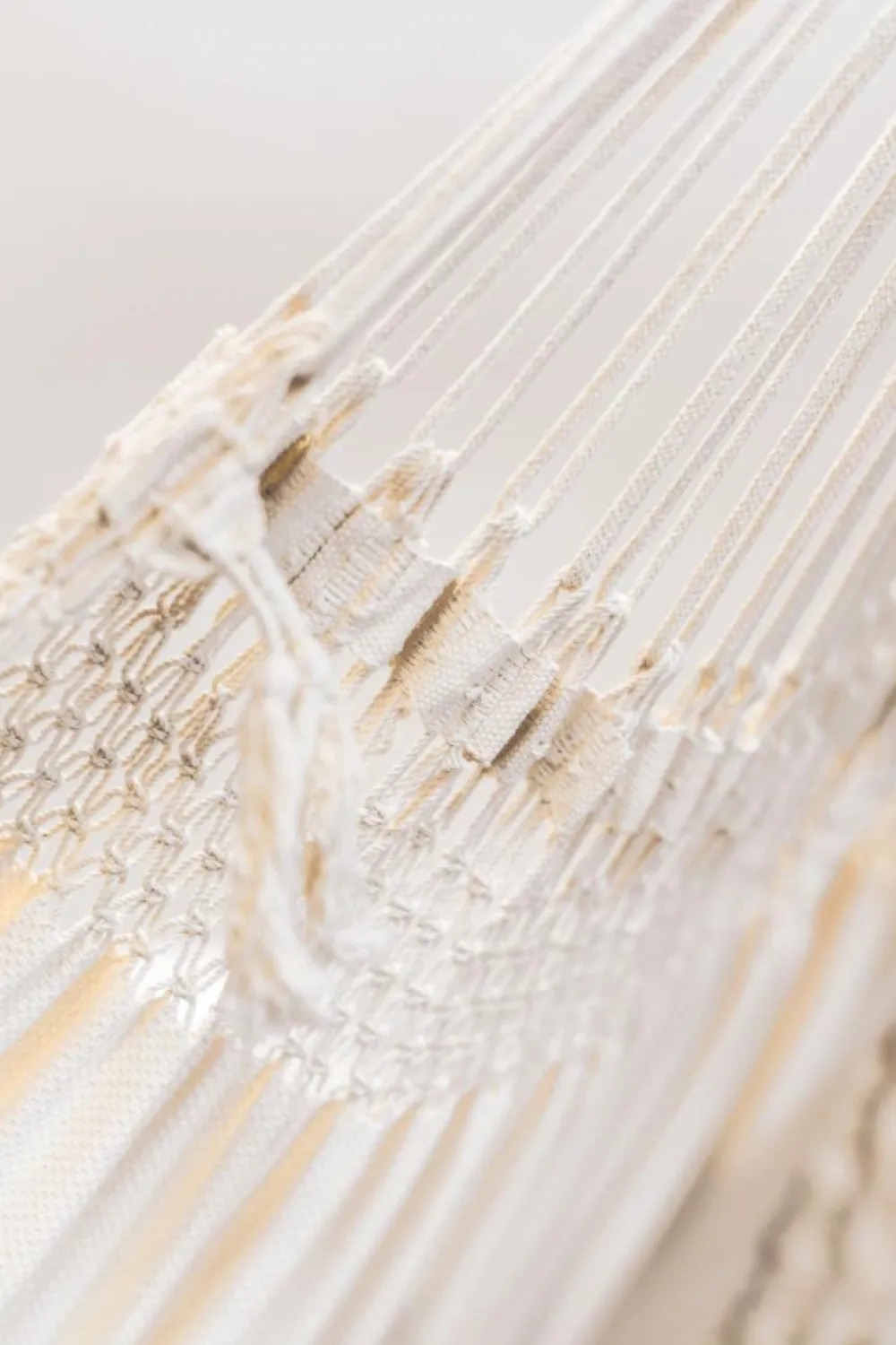 Har du bemærket det dekorative net mellem stoffet og snorene? Det hedder makramee og er et traditionelt, brasilianske net, der både er smukt at se på og sikrer en optimal vægtfordeling til snørene i begge ender. Det giver ekstra komfort.