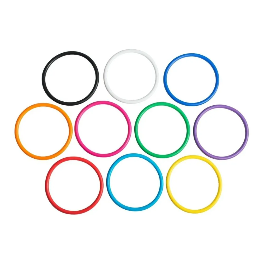 I pakken er der 10 ringe i forskellige farver, som alle har en diameter på 14 cm.