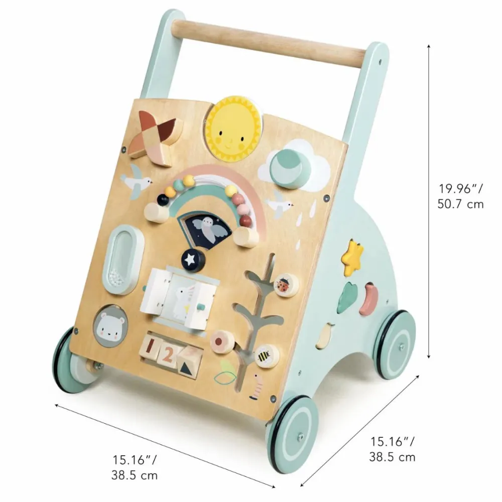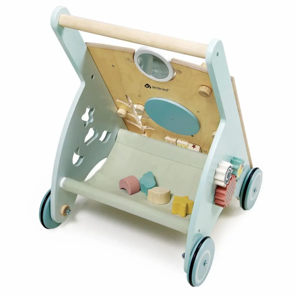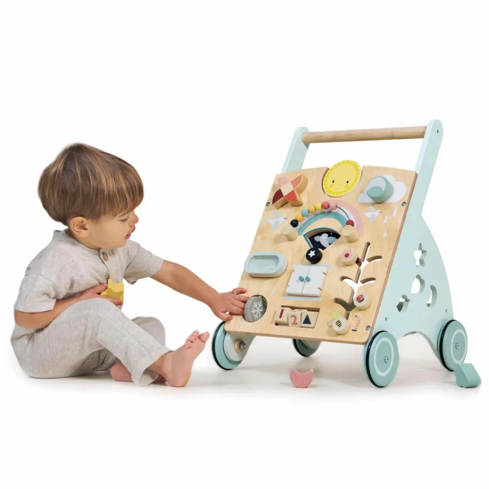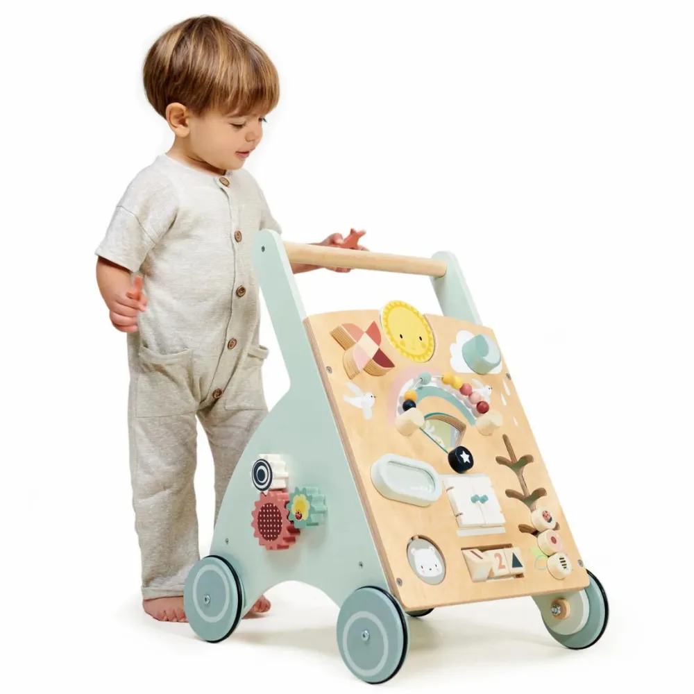 Dit barn træner gradvist sin balance mere og mere og vil med øvelsen drøne afsted hen over stuegulvet med sin gåvogn. Og når benene trænger til et hvil, er der masser at gå på opdagelse i af knapper der kan drejes, låger der kan åbnes og brikker der kan flyttes rundt.