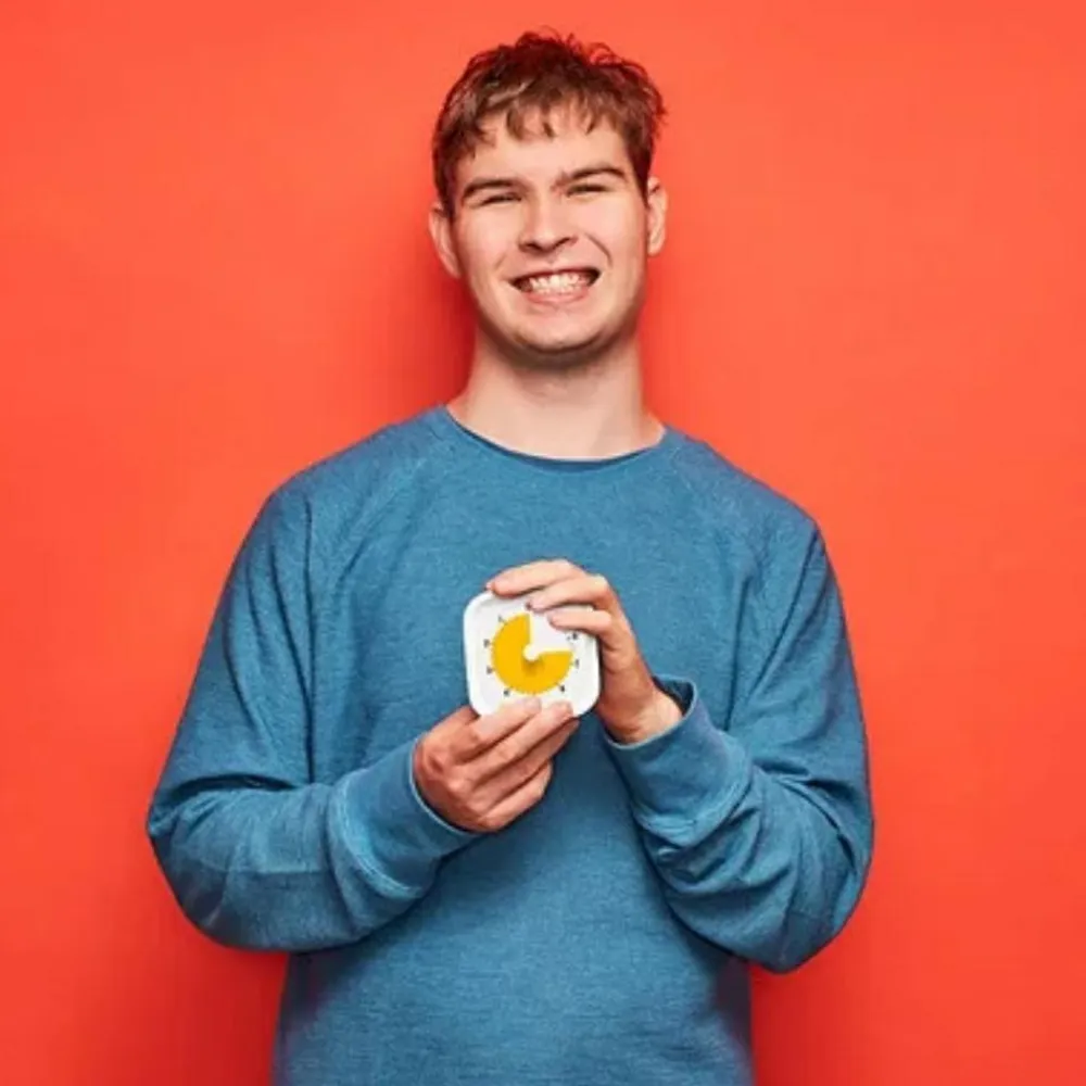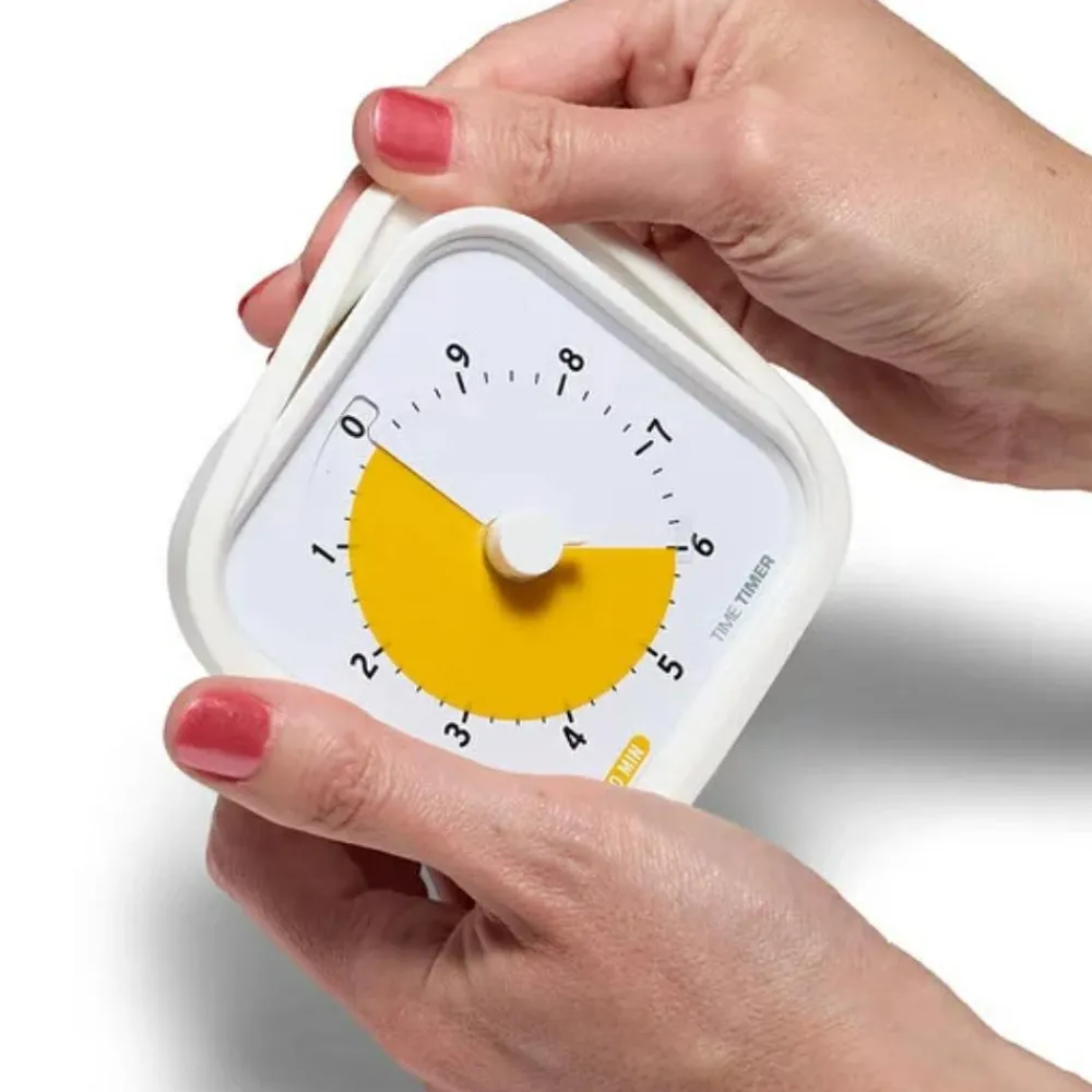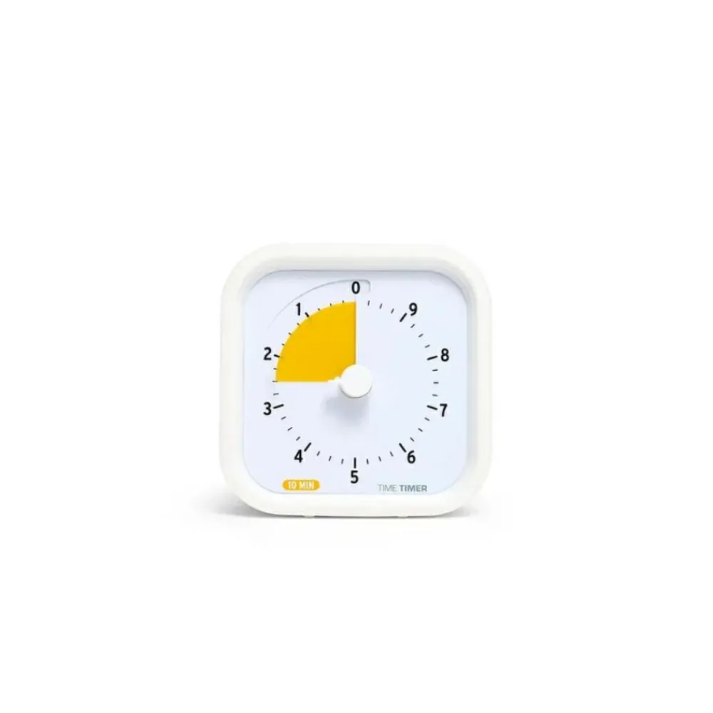 Det smarte visuelle nedtællings-ur er her i en udgave med tydelig gul skive og blødt, hvidt silikoneetui og på 10 minutter – til en lille pause, et hurtigt afsnit tegnefilm eller en kort fokusstund med opgaver, oprydning eller lektier.