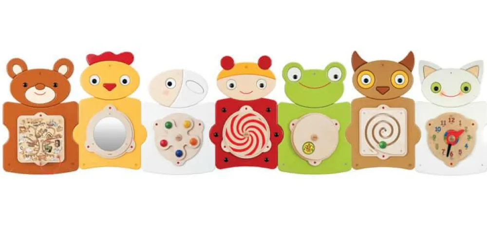 Herlig frø med interaktiv leg, hvor pladen på Fredes mave kan dreje, så forskellige illustrationer kommer til syne. Vægpaneler er 3-1 indretning af miljøer til børn.