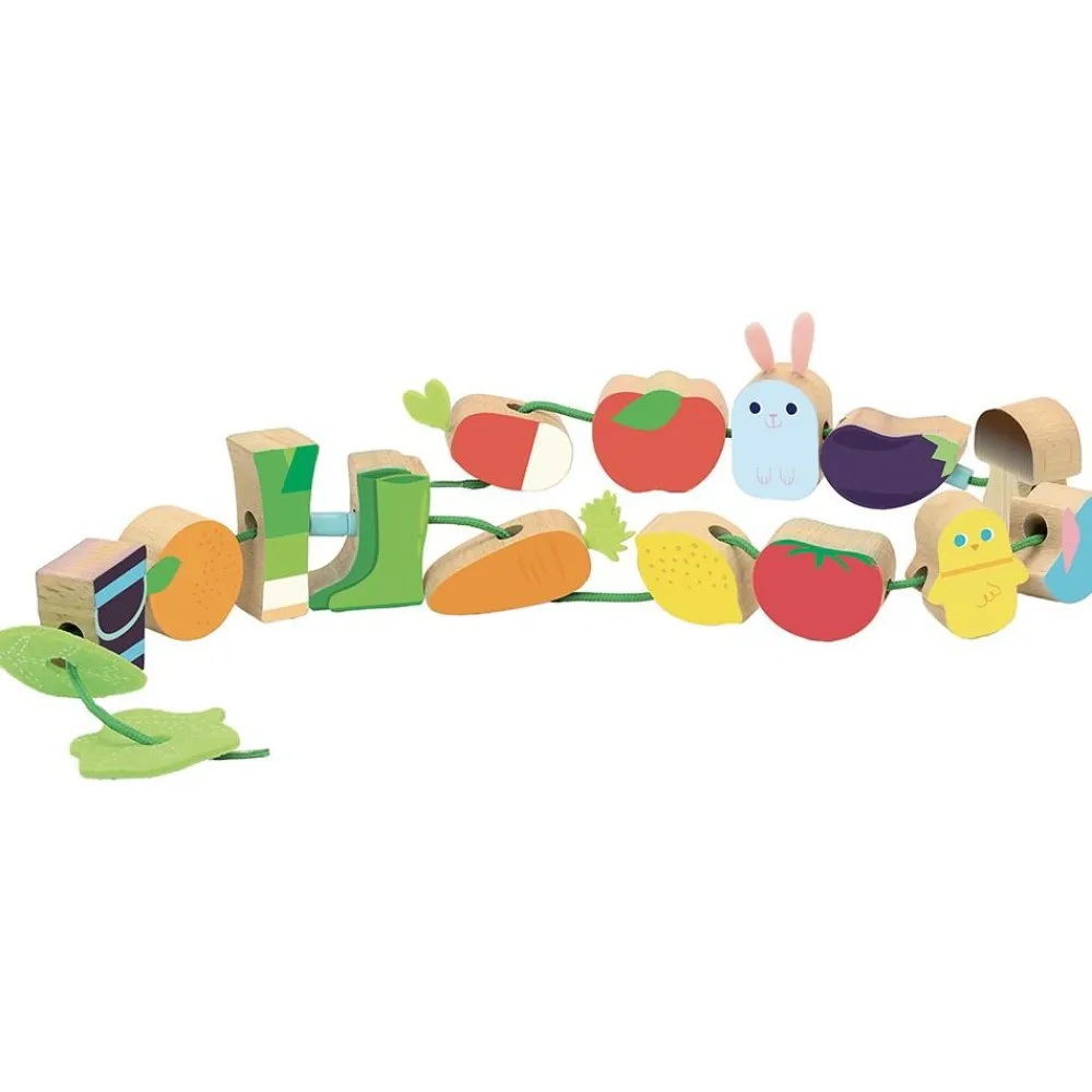 Det er en super god måde at øve finmotorikken på, når dit barn skal samle en perle op og sætte den på snoren. Der er både grøntsager, dyr og gummistøvler mm. med i dette søde sæt.