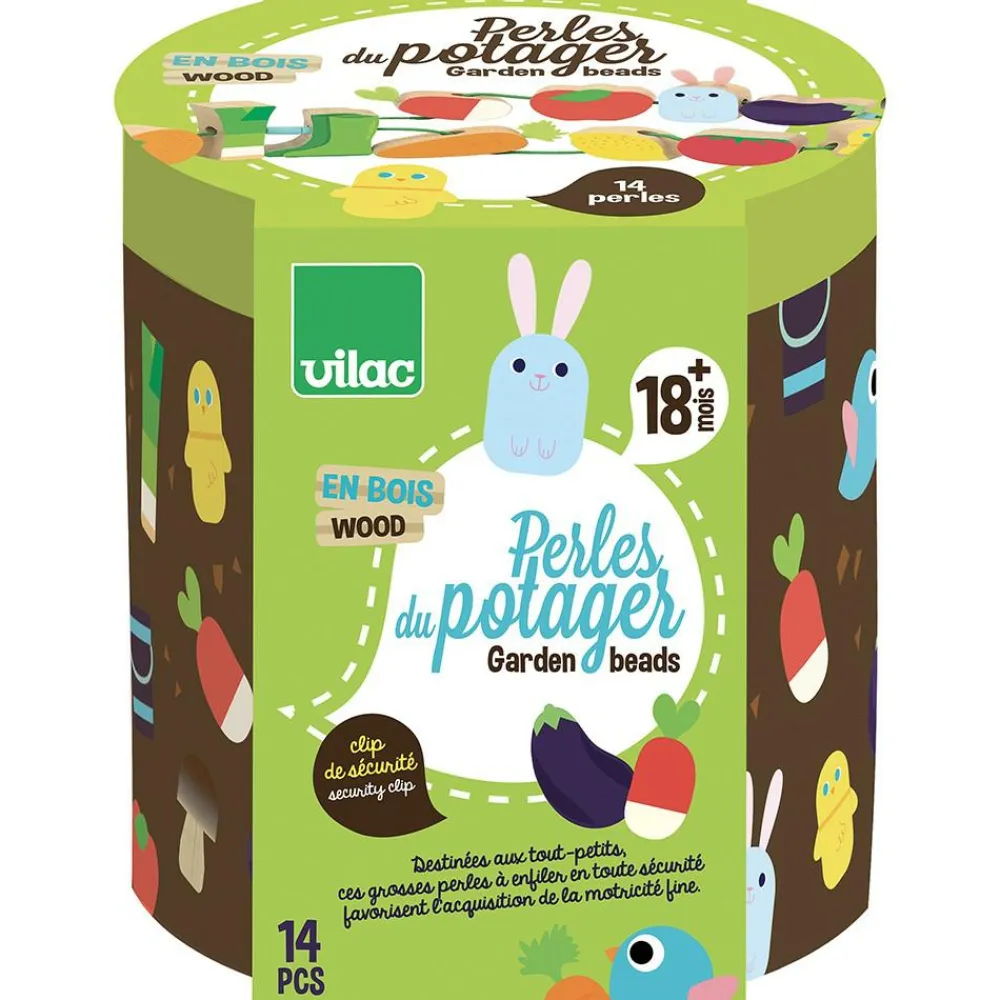 Fine træperler i et herligt design med grøntbed tema til børn helt ned til 18 mndr.