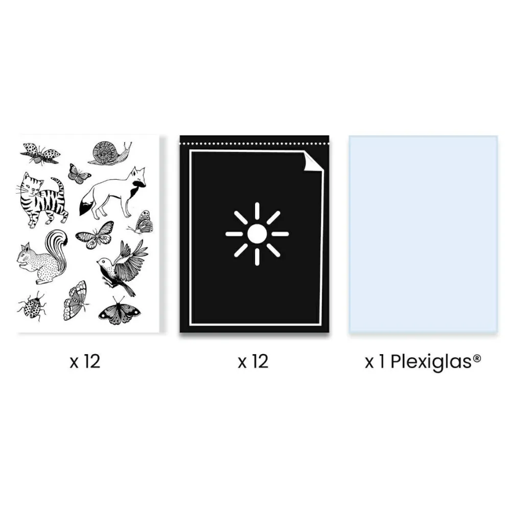 Sættet indeholder 8 ark lysfølsomt papir, skabeloner med dyr og en gennemsigtig plade, der holder det hele på plads i ventetiden.
