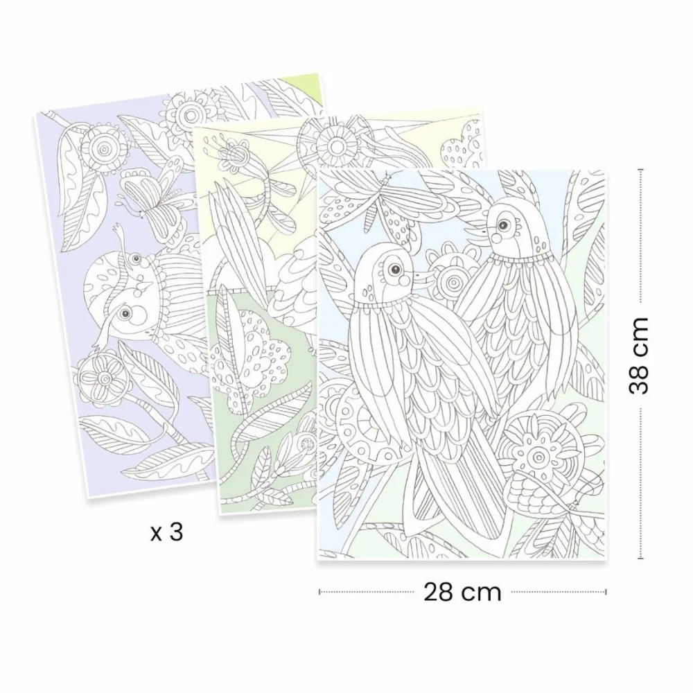 Sættet her indeholder 3 store (28×38 cm) plakater af tykt papir med printet motiv til at farvelægge.