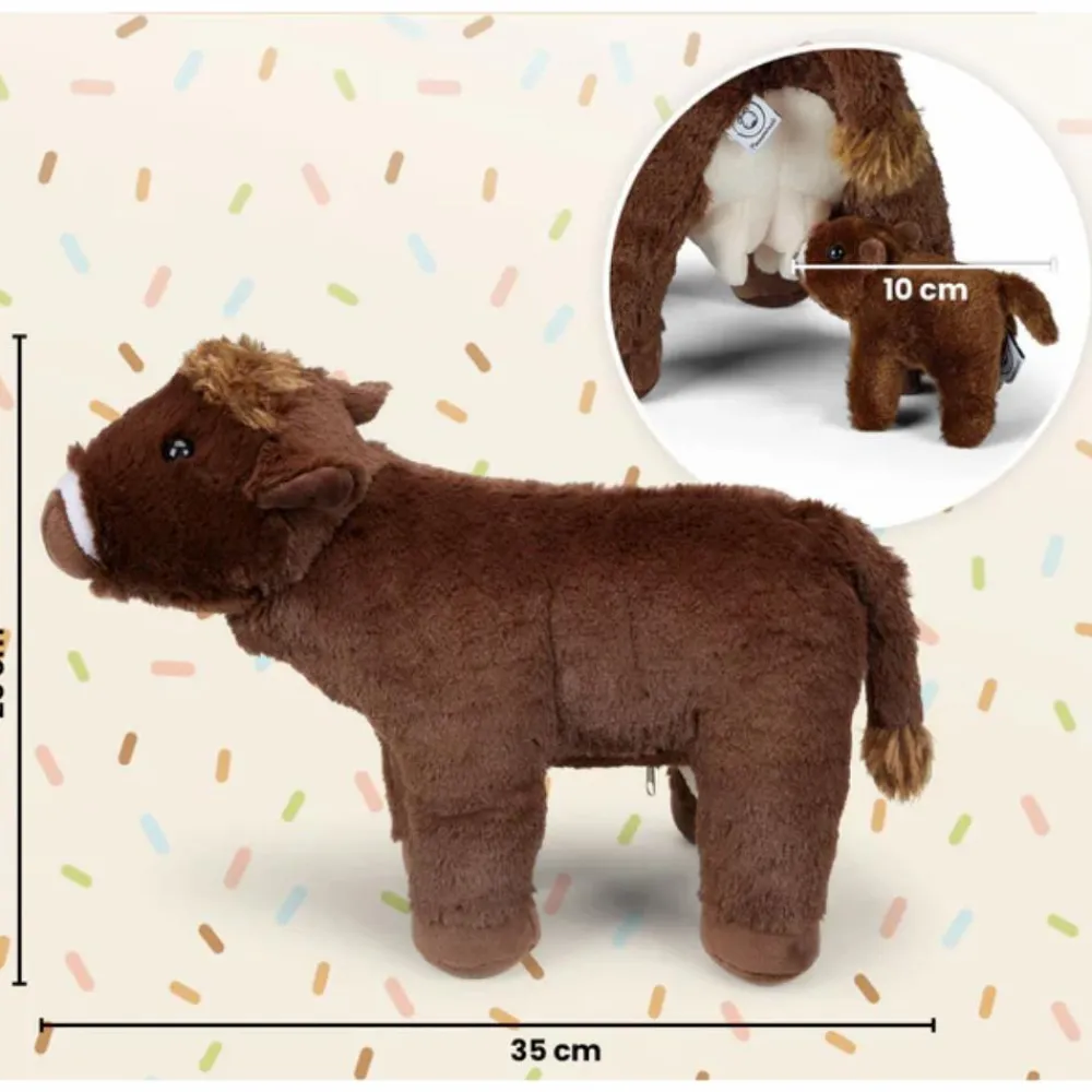 Der er en lomme i koens mave, hvor en kalven kan gemmes bag en lynlås. Dit barn kan lege, at koen er gravid, men det er også praktisk, hvis familiebamsen skal med i børnehave.