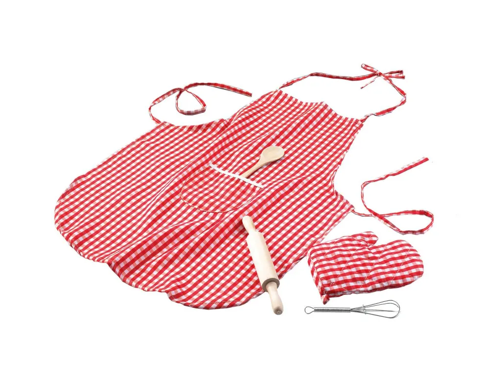 Klæd din lille køkkenhjælp godt på med forklæde, grydelap, træ-grydeske, piskeris og kagerulle i børnestørrelse.