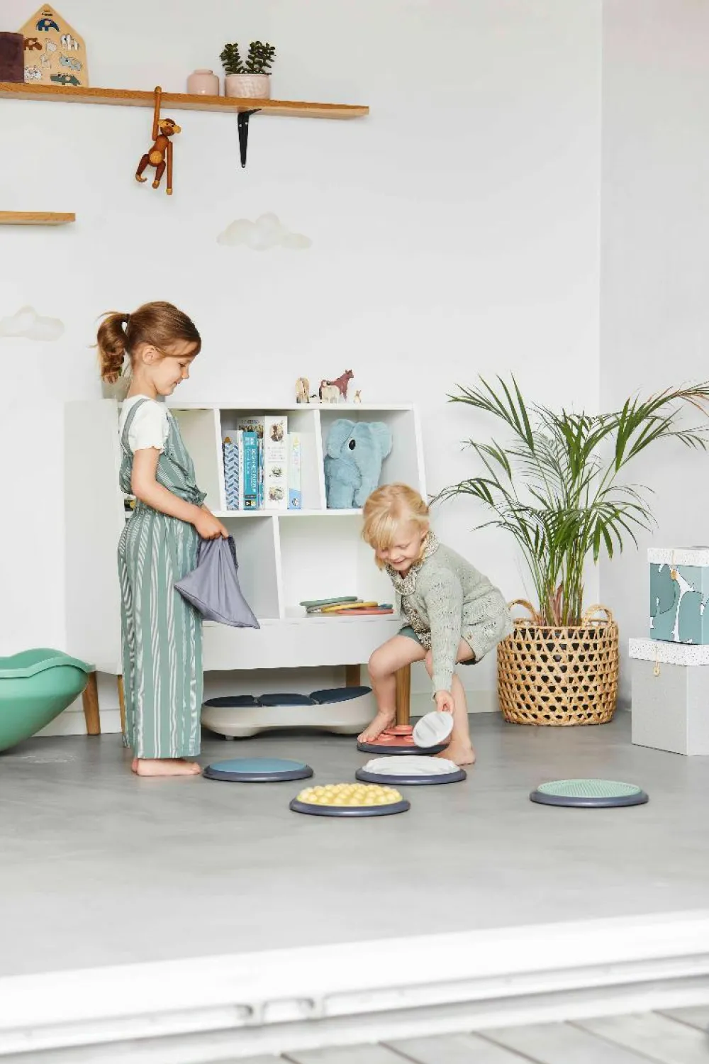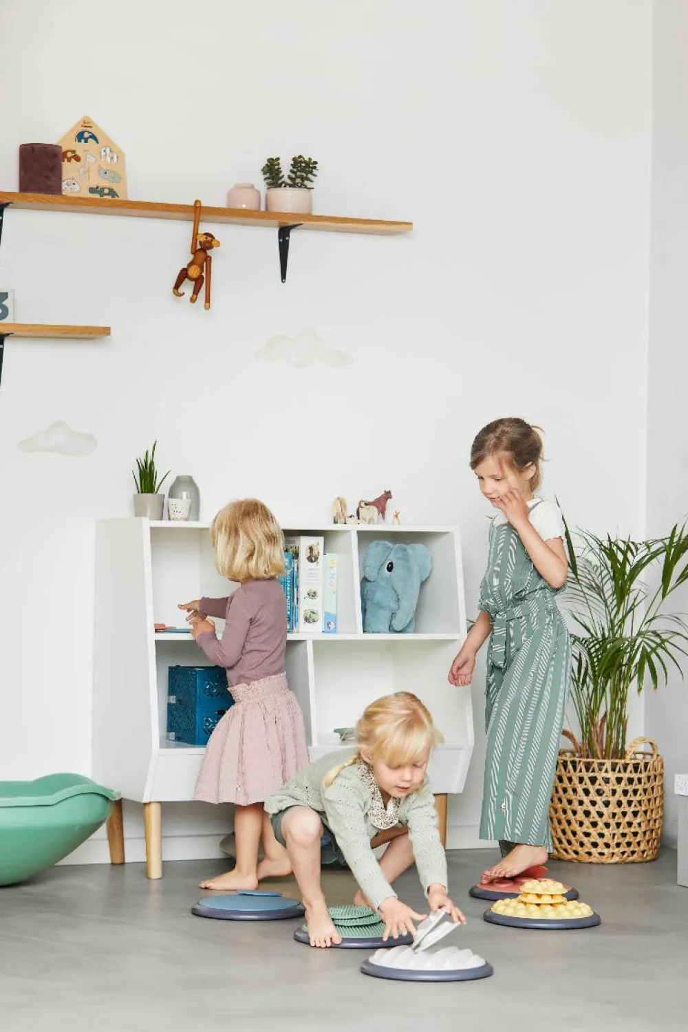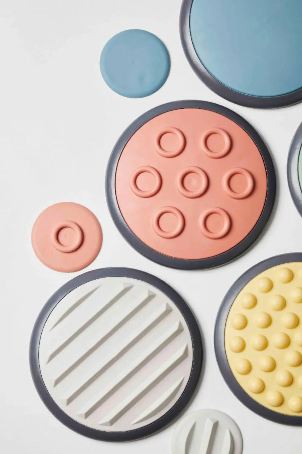 Disse føleskiver inviterer børnene til at bruge og udvikle deres følesans. Sættet består af 5 store og 5 små føleskiver, hver skive med eget mønster og farve. Designet er nyt og i fine, nordiske farver.