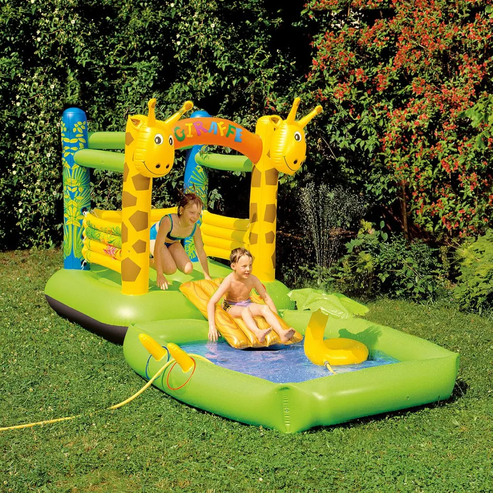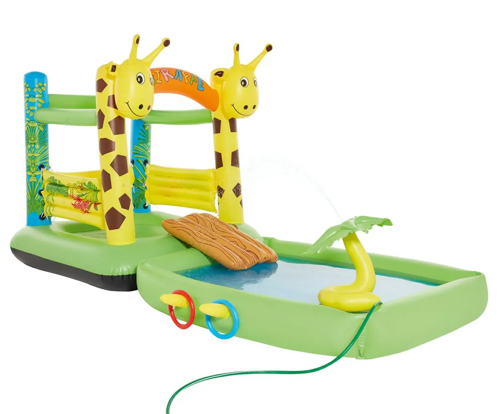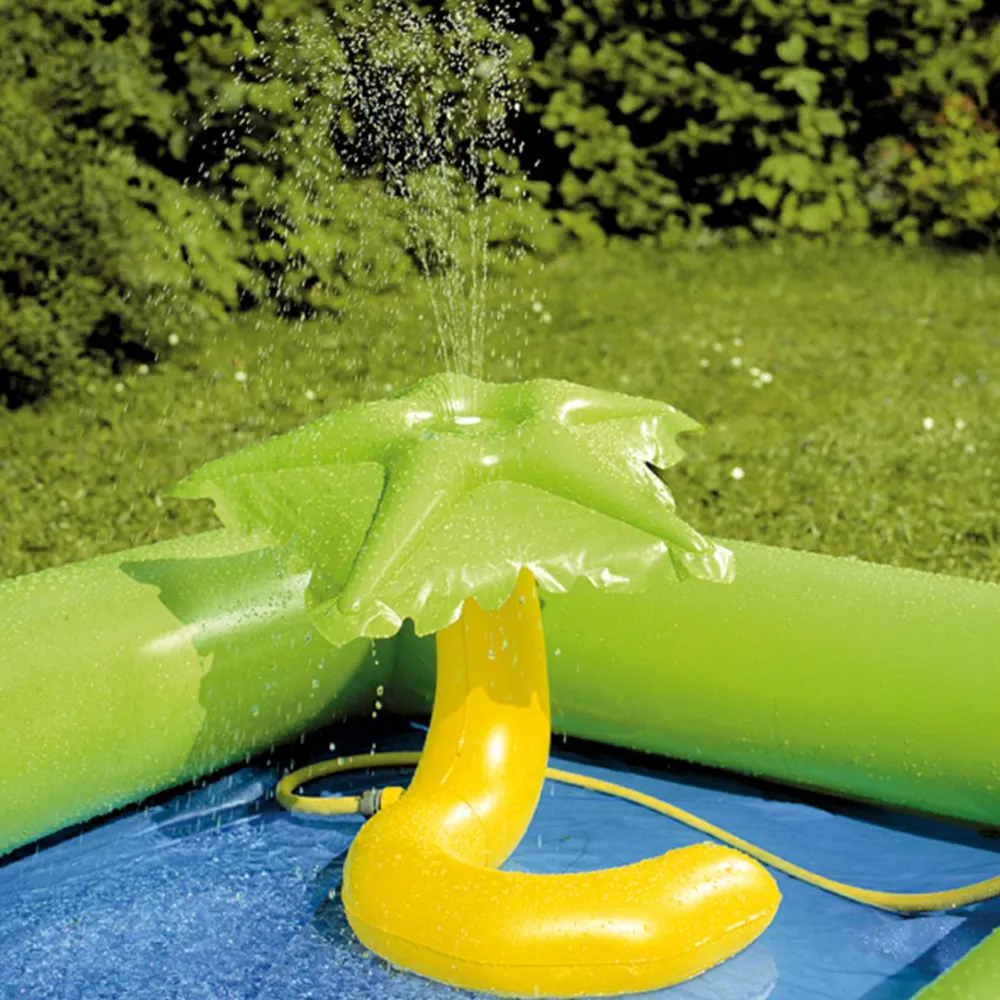 Hoppeborgen her kommer med rutsjebane, soppebassin og en palme, der kan sprøjte med vand og give følesansen et kick, hvis du tilslutter den en haveslange.