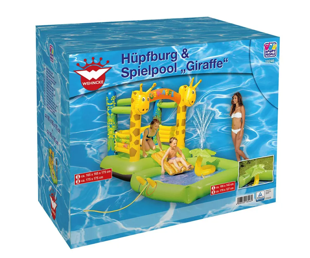 Hoppeborgen måler cirka 165 x 165 x 175 cm og badebassinet måler 195 x 142 cm.