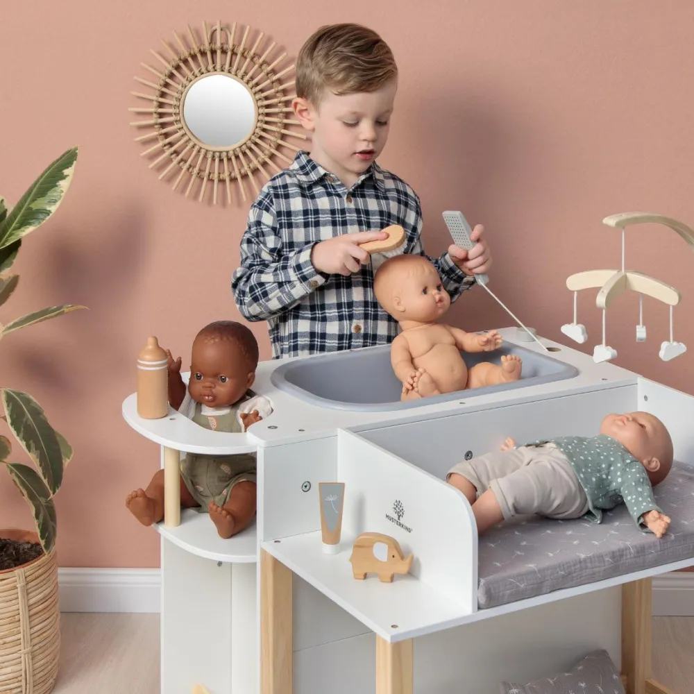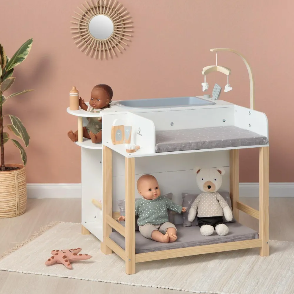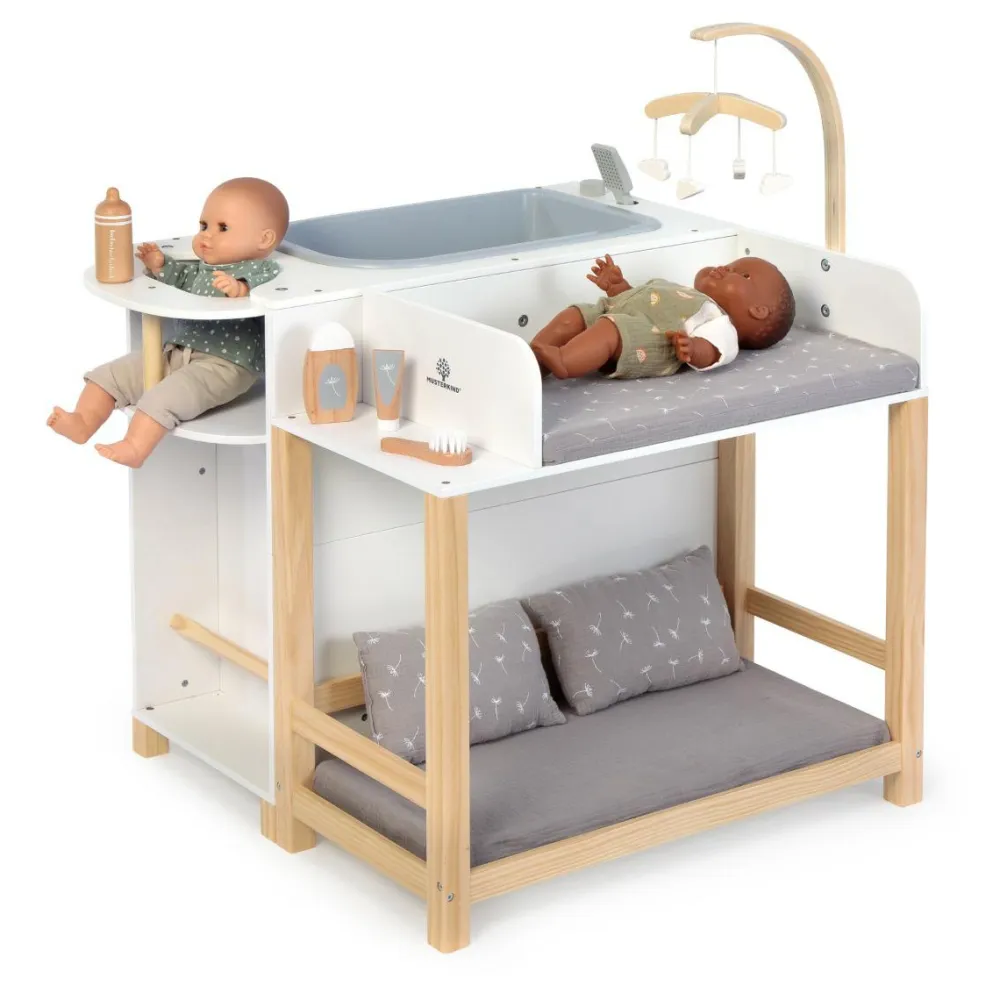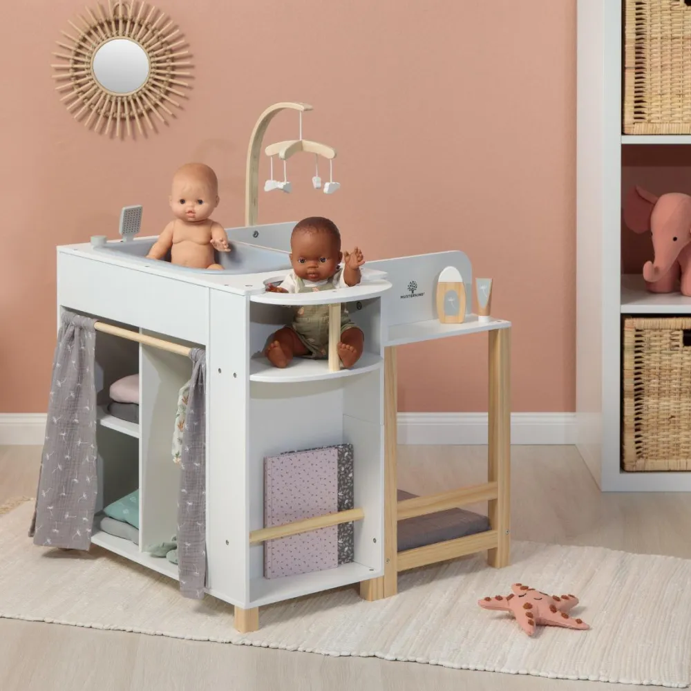Her er lidt af et luksus dukkemøbel hvor dukke både kan få sig et bad, få lidt at spise, få skiftet ble og sove lur i sin dukkeseng med madras (der kan være en køjeseng hvis vi tæller puslepladsen med). Der er også klædeskab med bøjlestang og hyldeplads til fx dukketøj eller hvad I ellers har af dukketing.