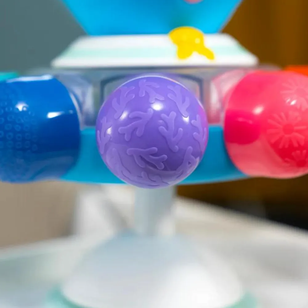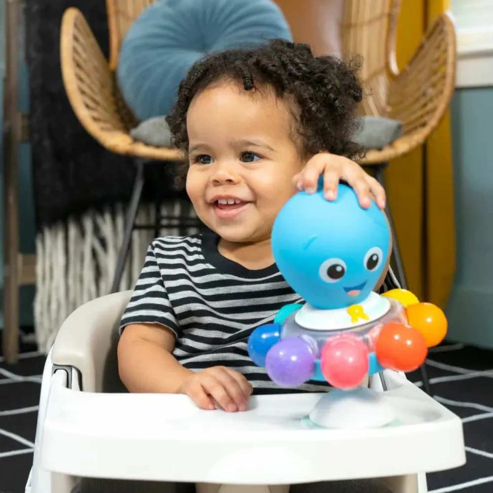 Når dit barn trykker på toppen af denne frække fætter, snurrer den rundt med raslelyde og alle de farverige dutter lyser op.
