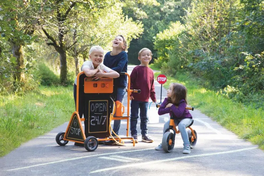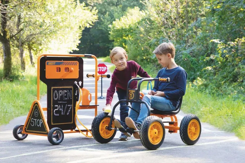Her kan gåbiler, motorcykler og måske også løbehjul og løbecykler få en optankning af benzin, energi, strøm, super-saft – lige hvad I finder på, når der er leg på hjul.