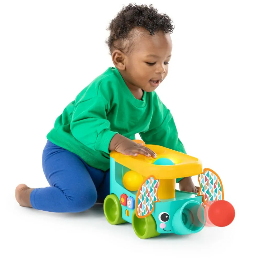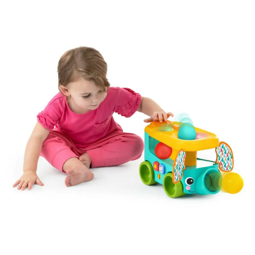 Prop bolden ned i hullet i bussens top og send den ud gennem elefantens snabel.