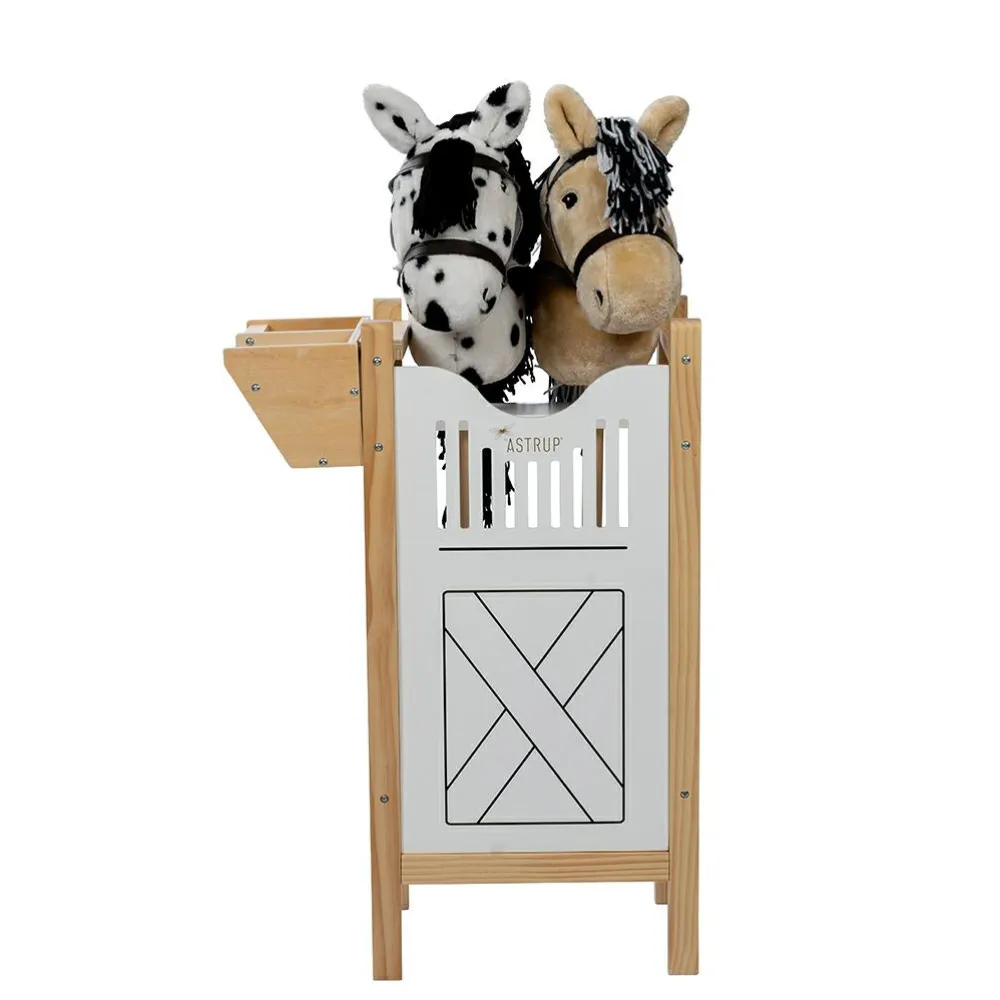 Hesteboksen er 65,6 cm høj og 24,5 cm bred så den passer i størrelsen til to kæpheste, der kan stå og hygge sig og slappe af og få en bid mad fra fodertruget, som kan hænges på siden.