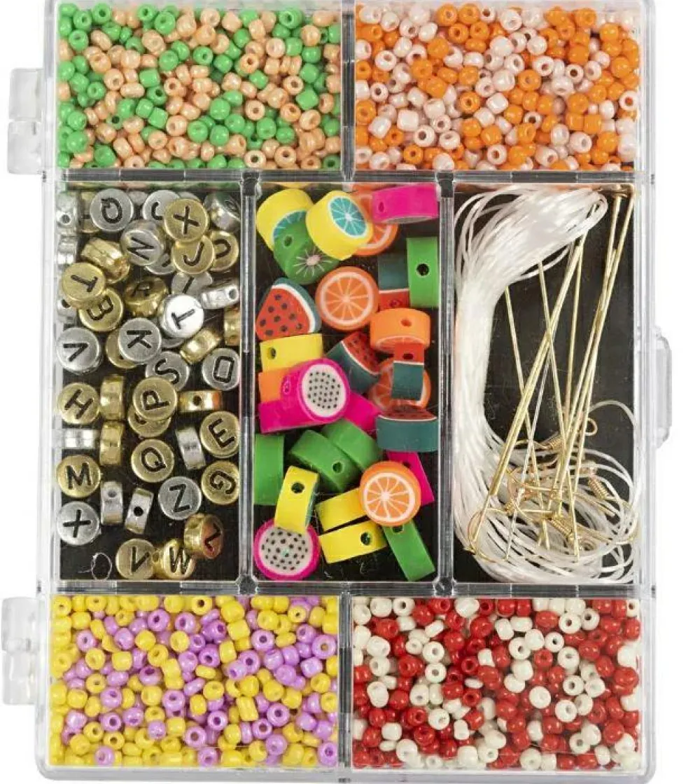 Et fint kit med mange forskellige slags perler, elastiksnor og tilbehør til smykkeproduktion af armbånd, halskæder og øreringe.