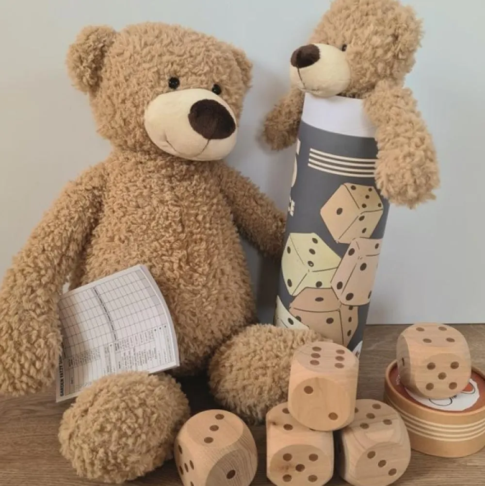 Der er stadig 5 terninger og en pointblok, men de store terninger gør det bare sjovere at spille.
