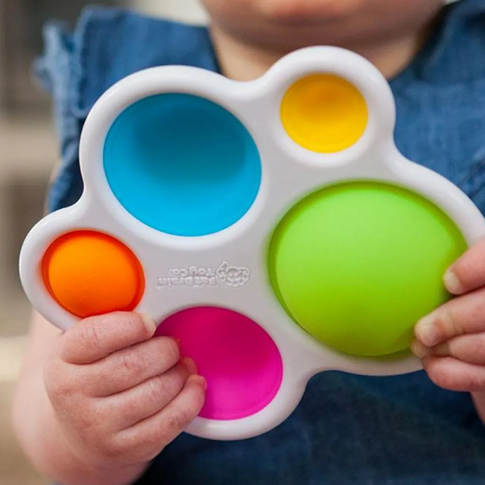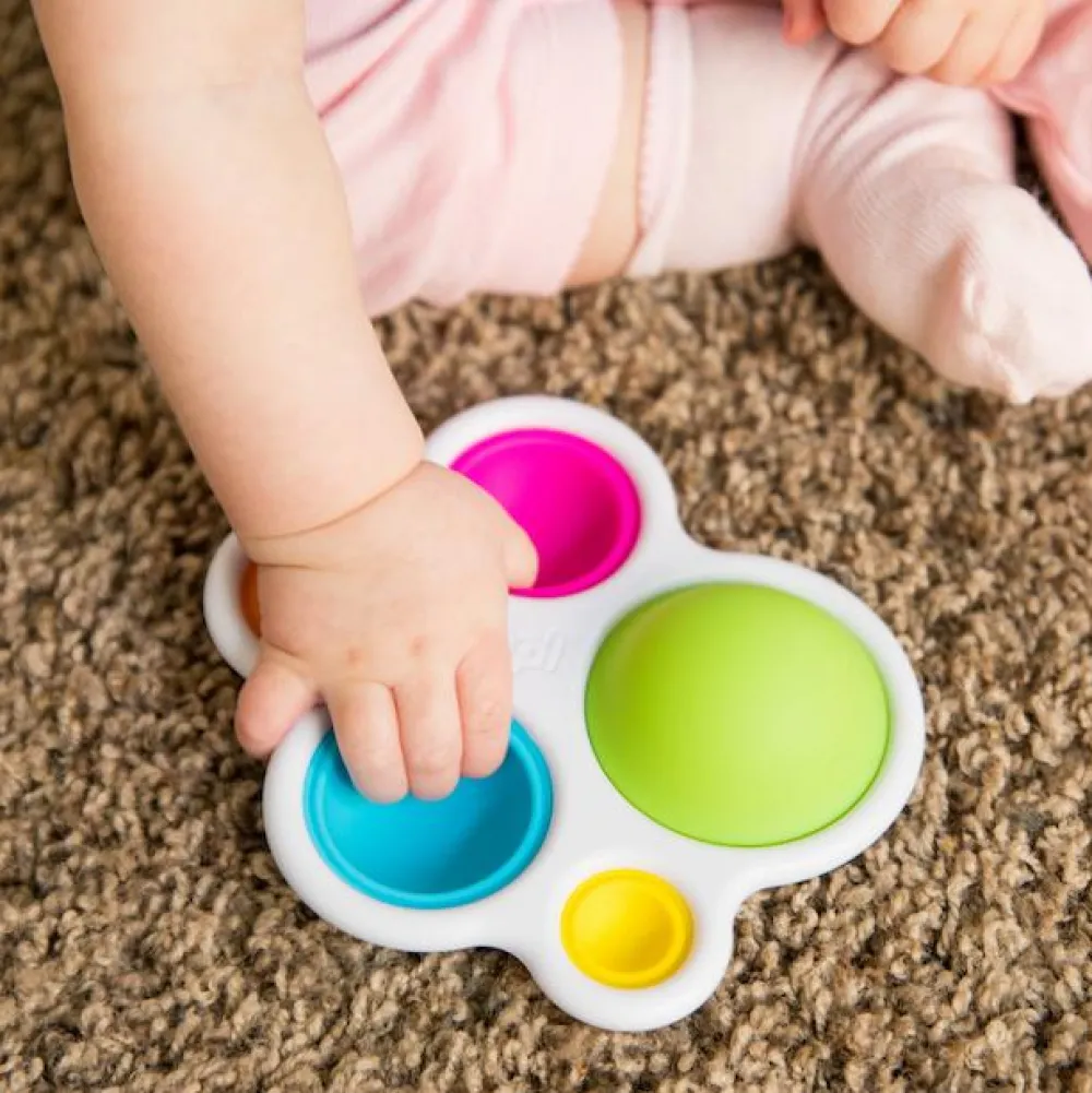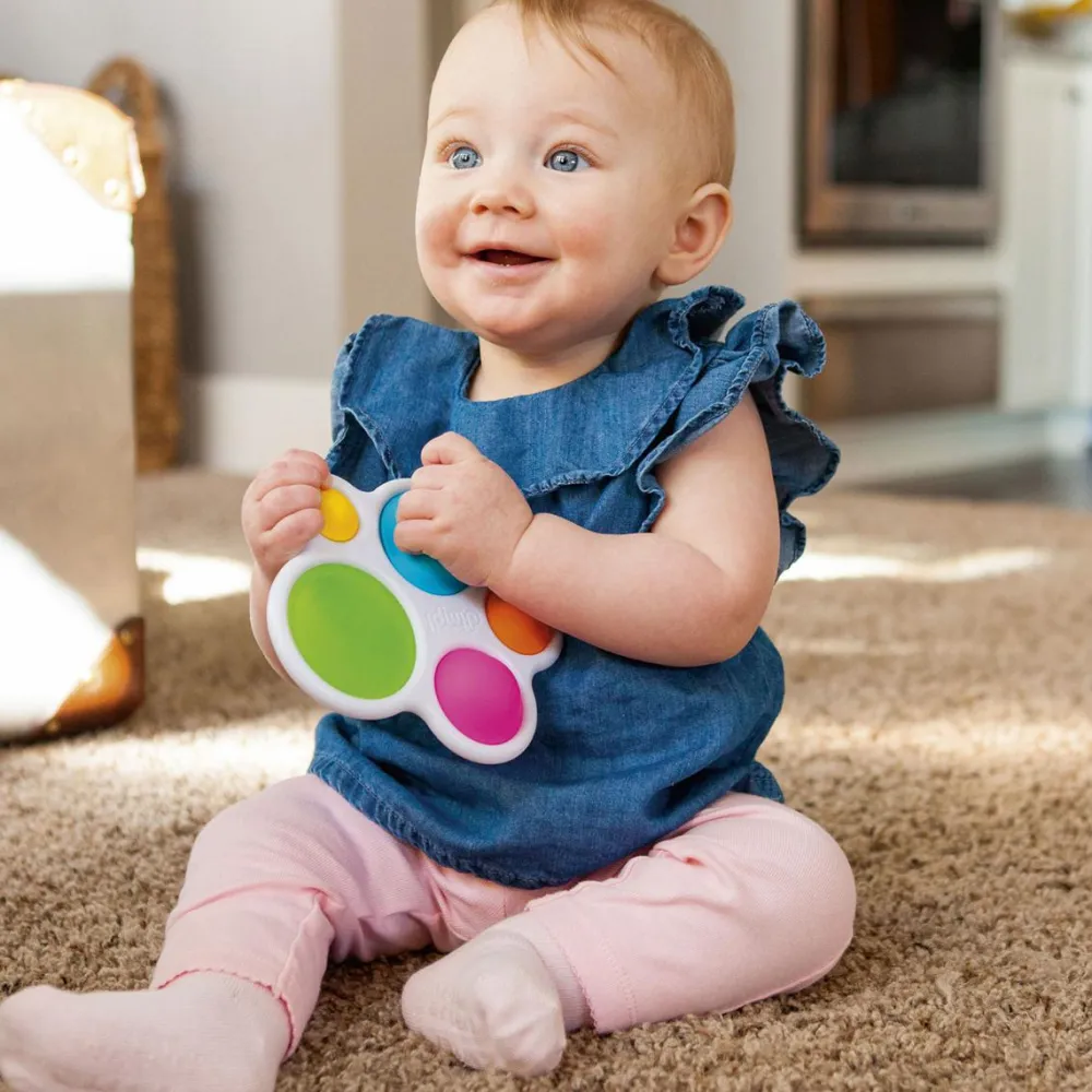 Med Dimpl stimuleres dit barn til at sanse, føle, høre og se. Der er knald på farverne, og de 5 silikonebobler kan trykkes ned og vendes.