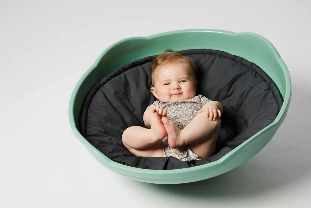 Tumletoppen har en kant, så hovedet ikke rammer gulvet. Buerne gør, at fingrene ikke kommer i klemme, og der er luft, hvis den bruges som skildpaddeskjold.