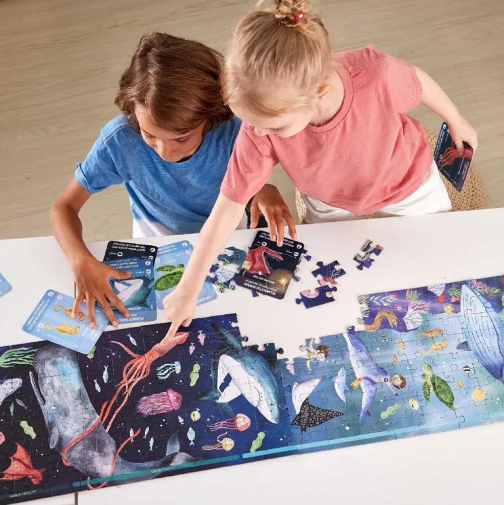Har puslespillet et særligt motiv som fx anatomi, junglens dyr eller verdens flag, så styrker det ordforrådet hos dit barn, når I snakker om det, mens I lægger brikkerne.