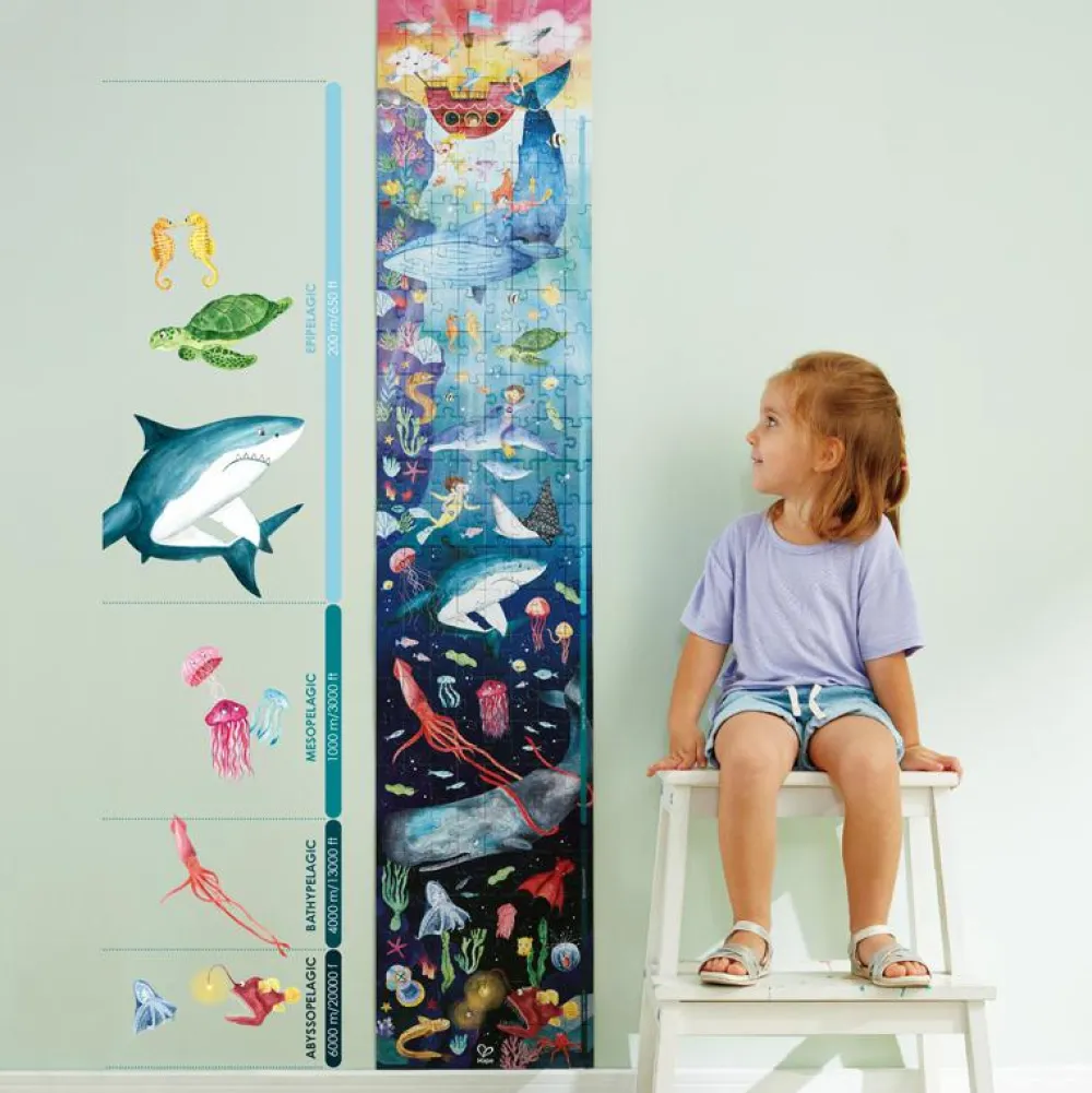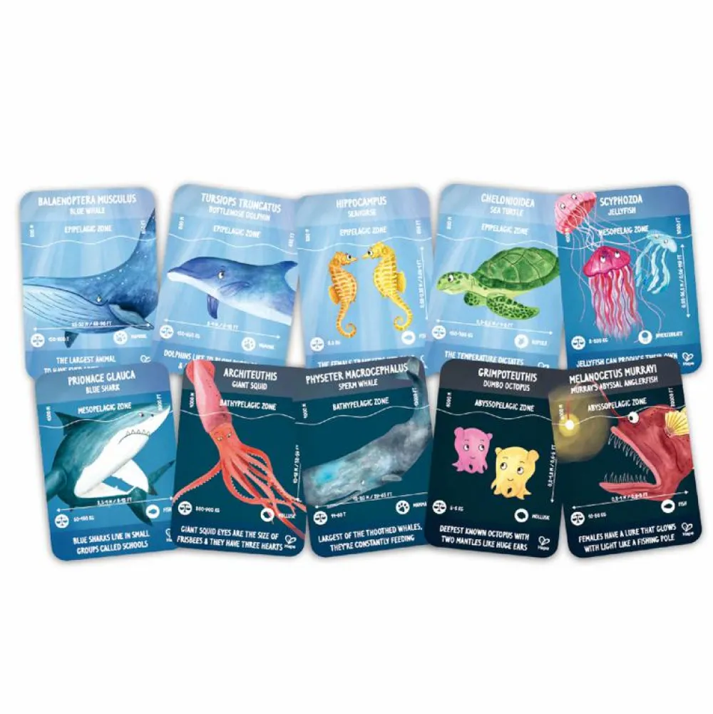 Der er fine motiver af alskens former for liv under vandet, og der er 10 kort med fakta om de dyr, der gemmer sig under havoverfladen.