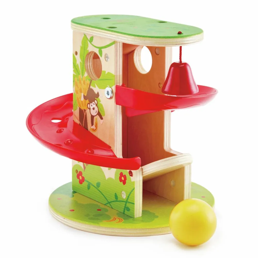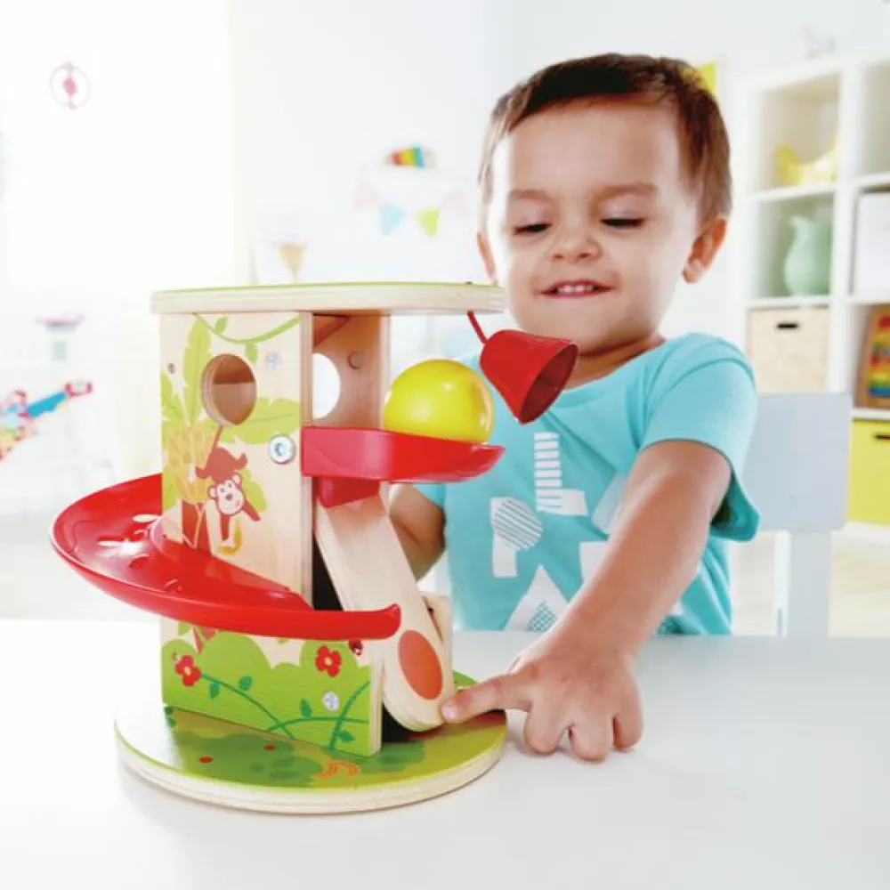 Lad kuglen trille afsted så klokken ringer. Med et tryk kommer kuglen op igen med et slags elevatorsystem og kan trille endnu en gang.