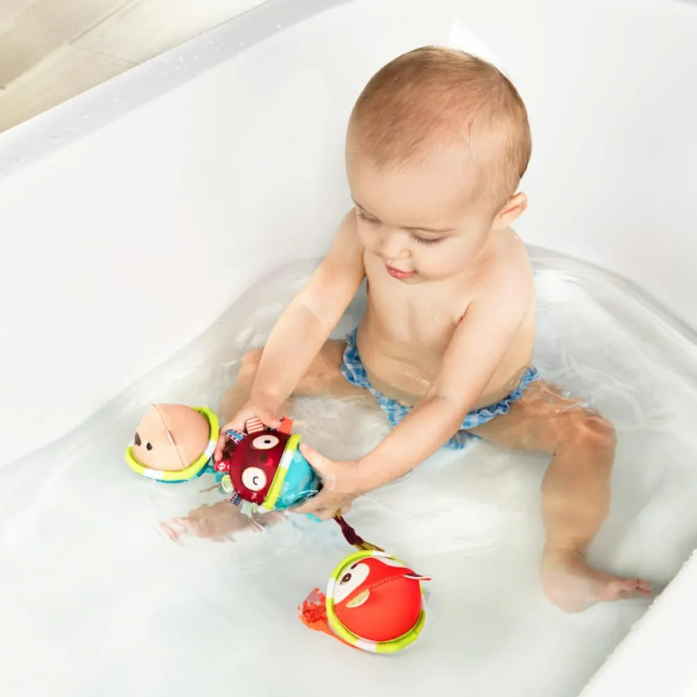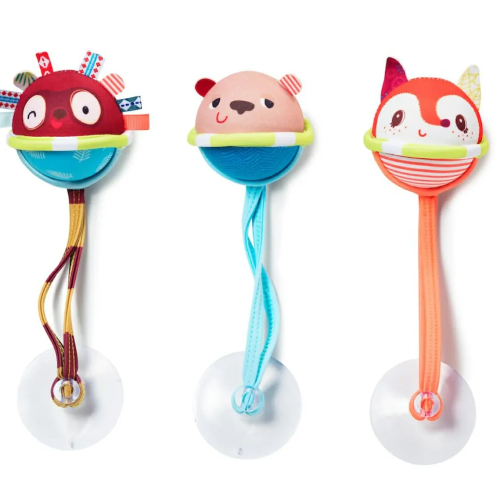 Bolde i badet er sjovt, men ikke originalt. Det fine her er, at du skal sætte dem fast i bunden af badekarret med sugekopperne for enden af stroppen, og så “står” boldene i vandet foran dit barn.