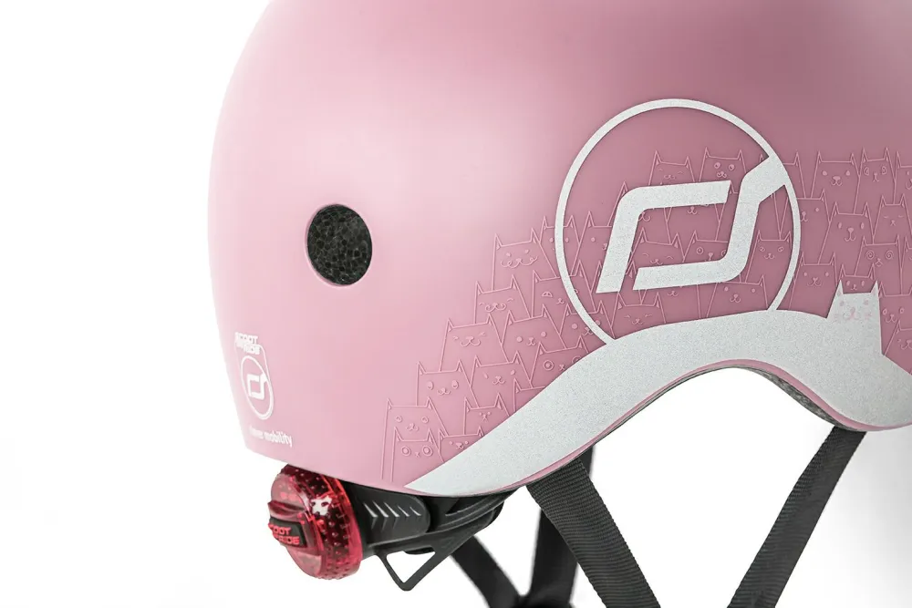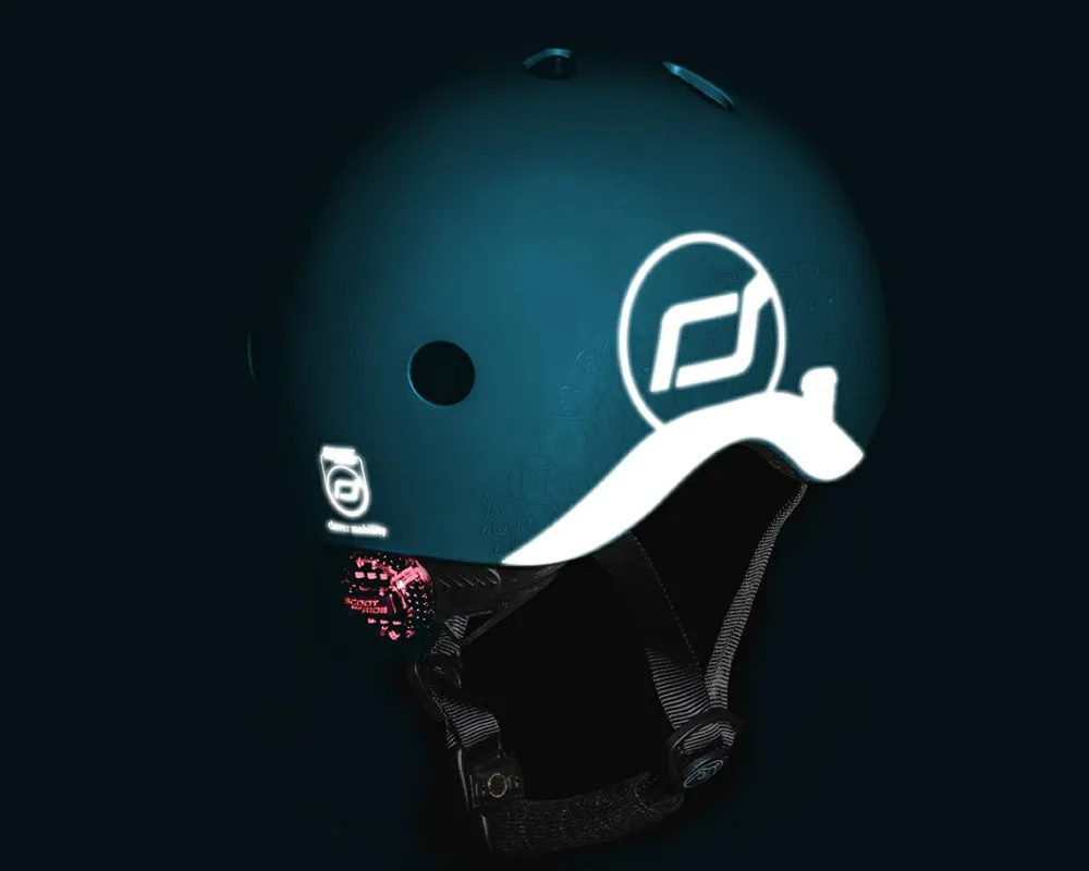 Denne cykelhjelm til baby har både rød lygte i nakken og store reflekser på siderne og bagpå. Det giver øget synlighed, når I cykler til dagpleje en tidlig morgen, eller hvis dit barn har fået fart på sin løbecykel.