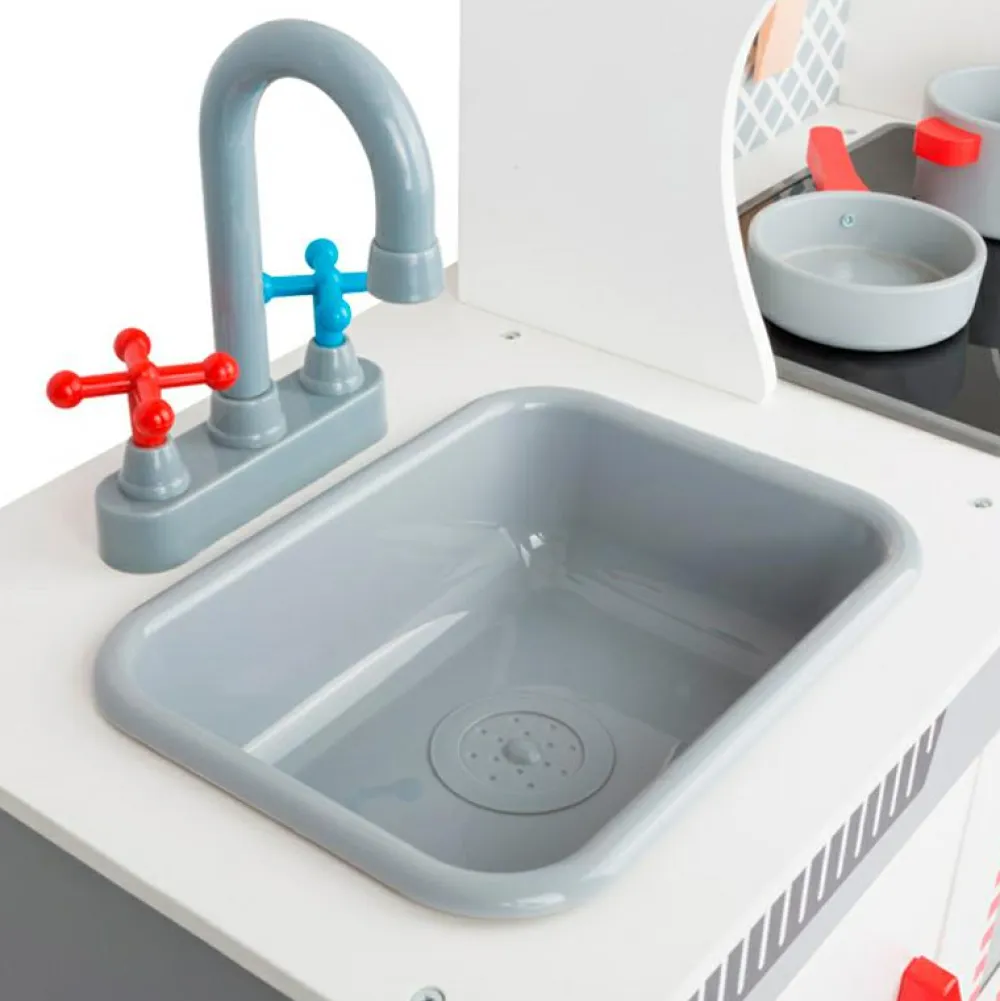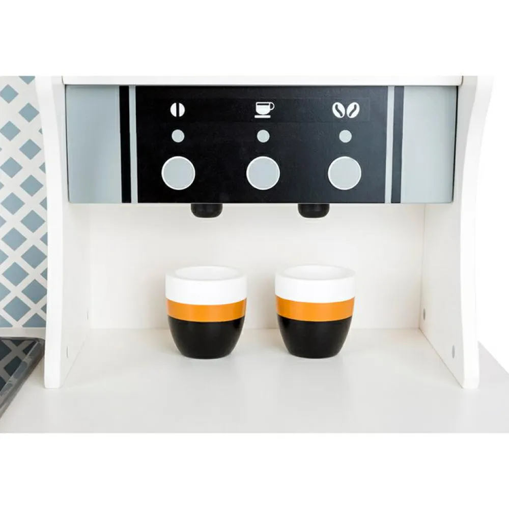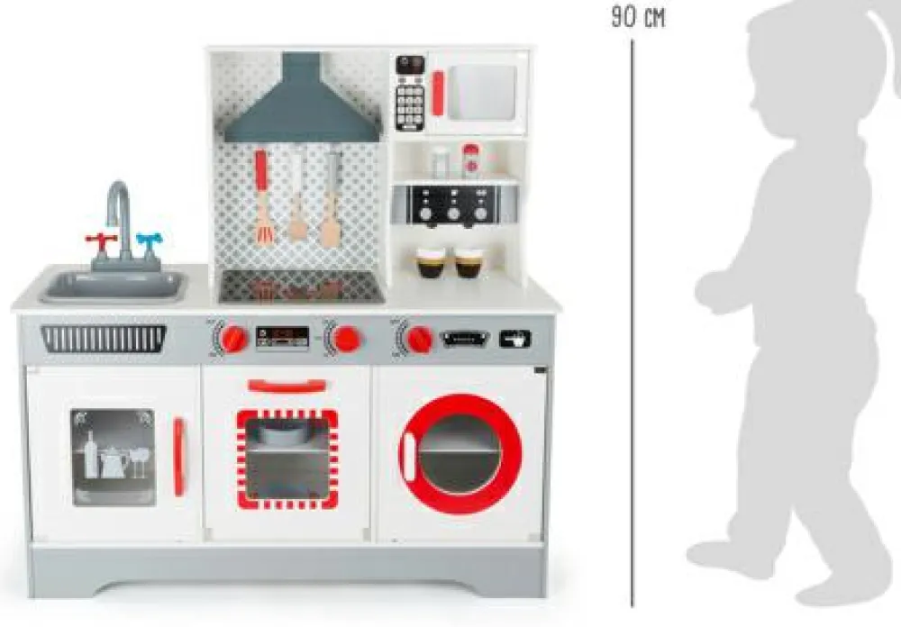 90 cm stort legekøkken, hvor flere børn kan samarbejde om at lave mad, brygge kaffe og tage opvasken.