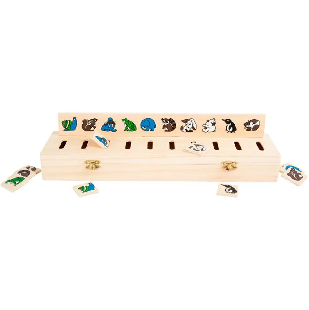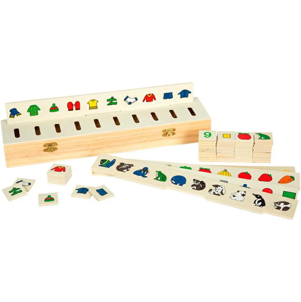 Hvilke starter I med? Og hvem kan sortere hurtigst? Og kan dit barn navnene på alle motiverne? Der er to af hver lille motiv-flise, så to kan sortere samtidig og dyste mod hinanden.