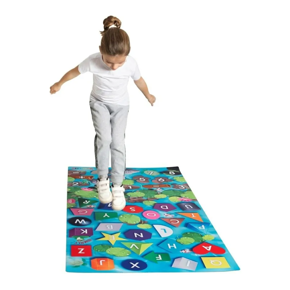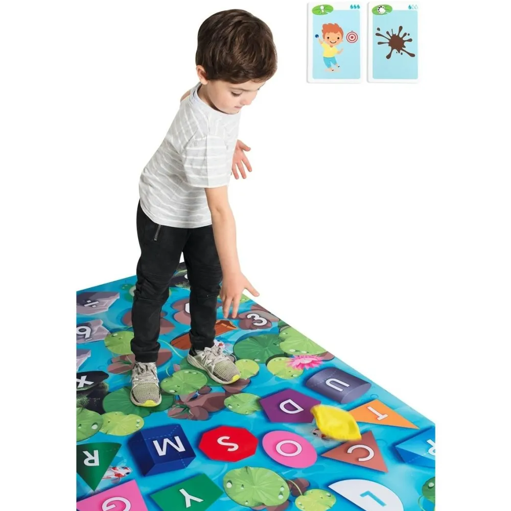 Med dette læringstæppe følger der 108 kort med opgaver i forskellige sværhedsgrader, som børnene skal lege sig frem til løsningen på ved at hoppe rundt på tæppet som små frøer i en sø.