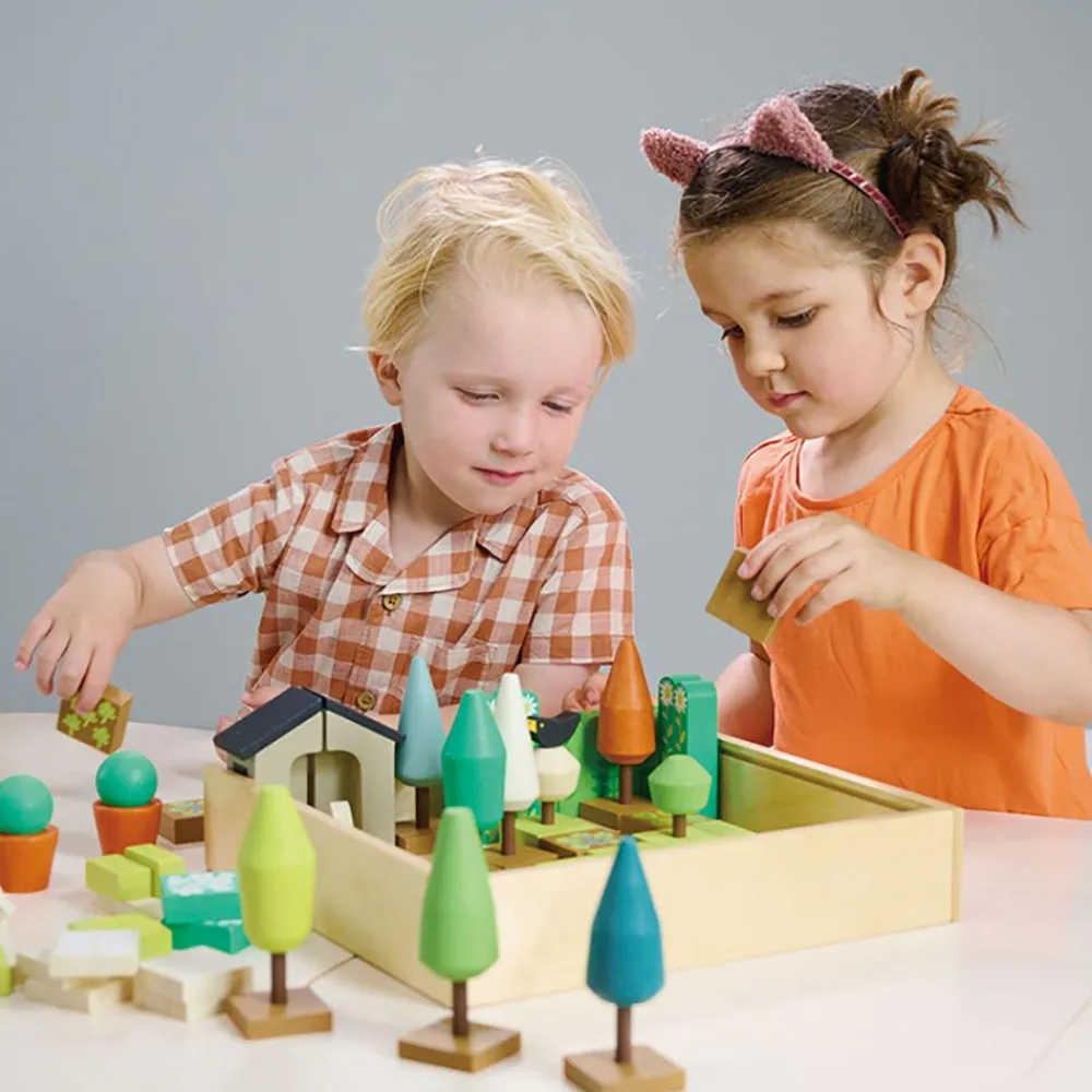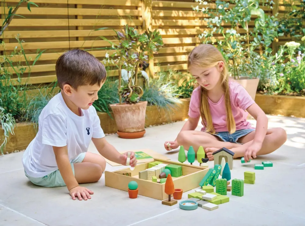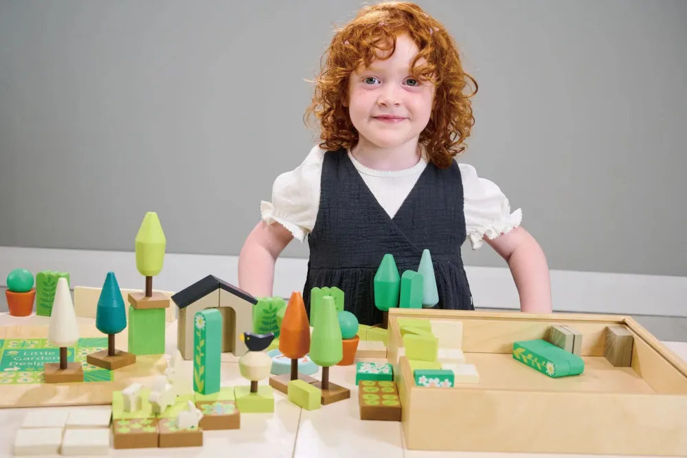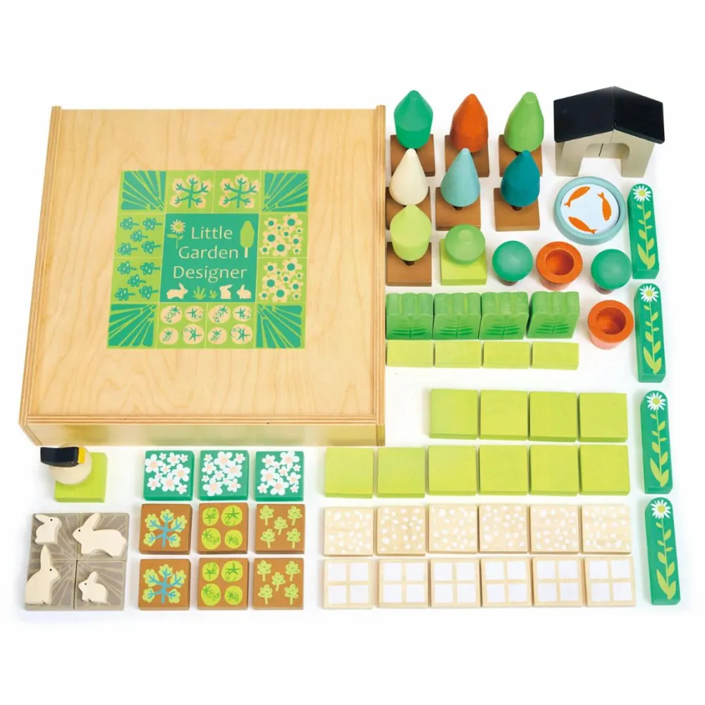 Dit barn kan arrangere de over 60 fine og solide træstykker på utallige måder med forskellige havedesigns som resultat.