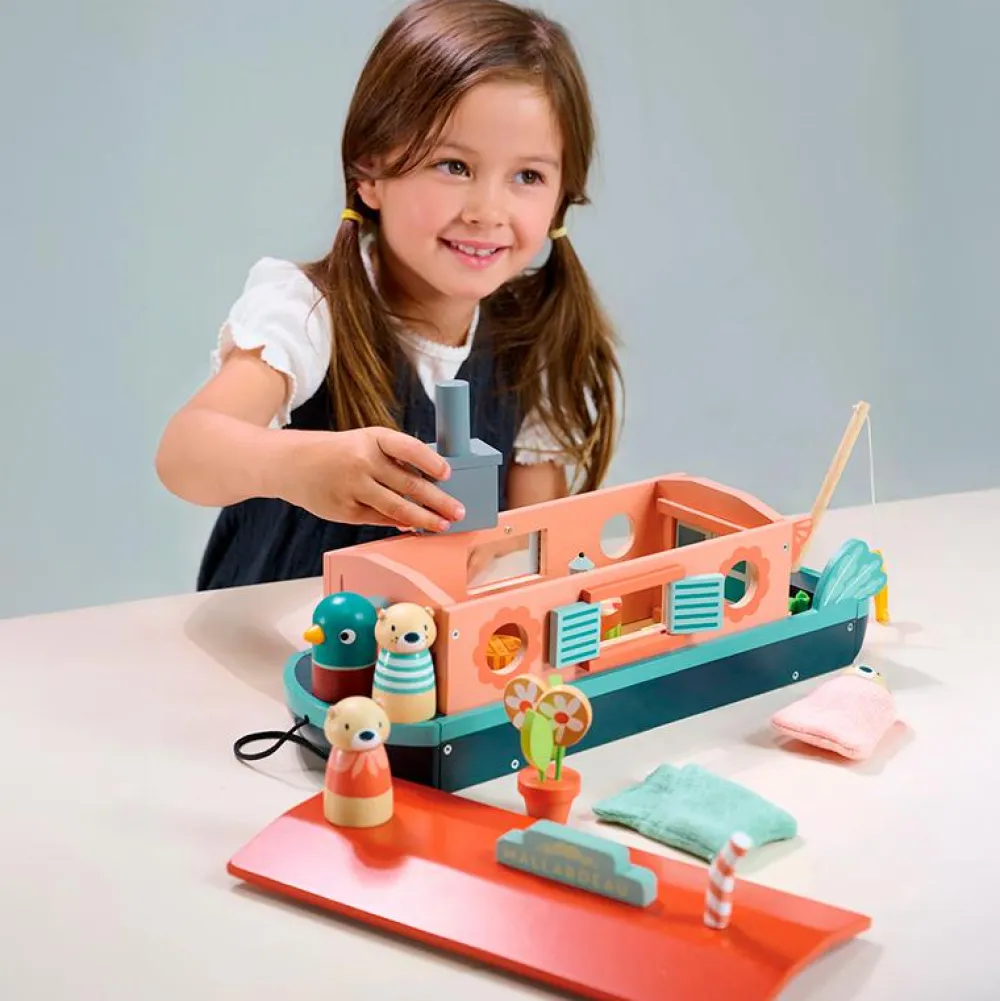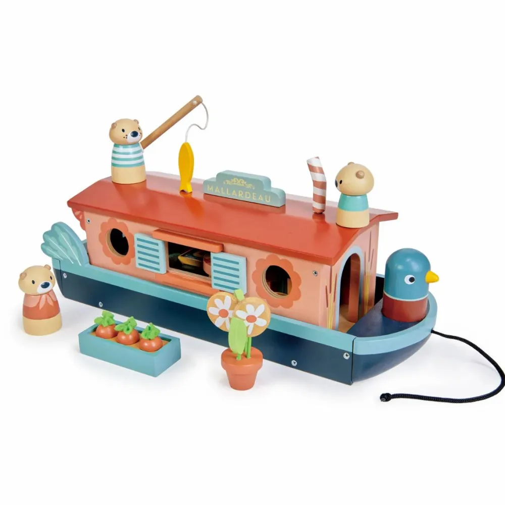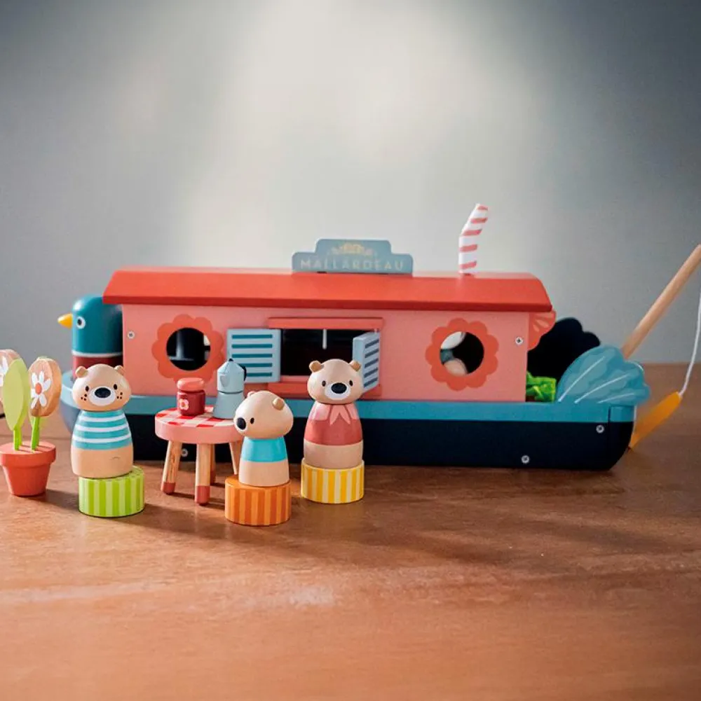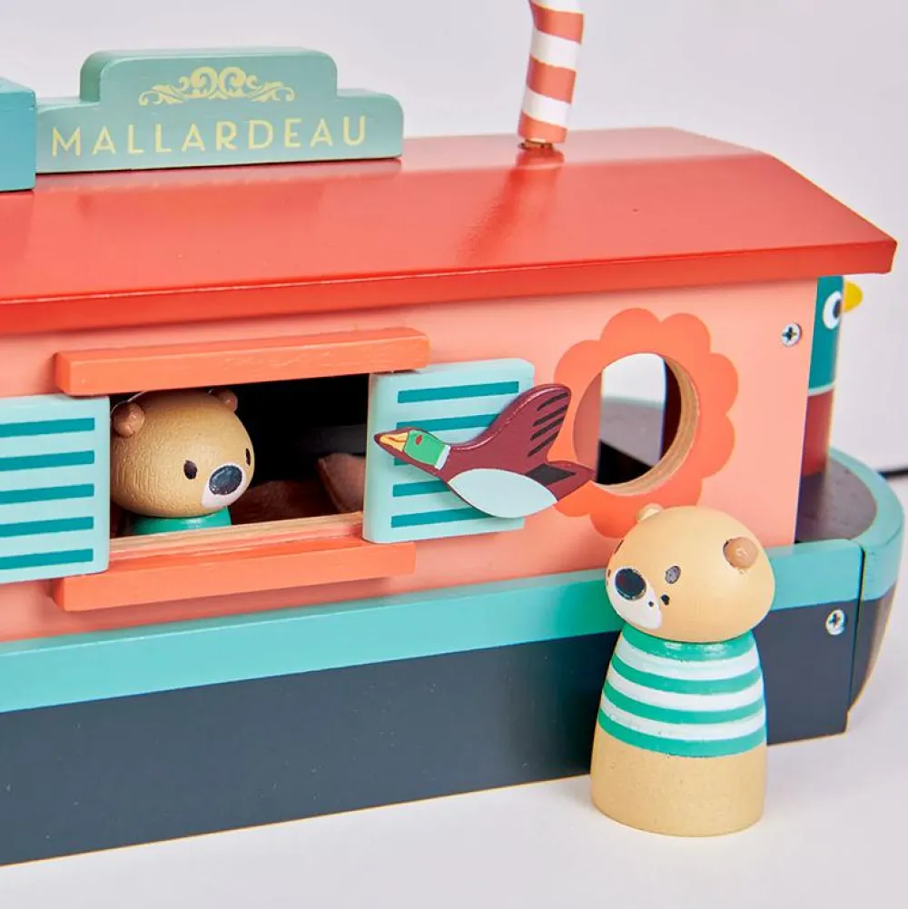 Vældig kært træ-dukkehus hvor dukkerne er små oddere, der selvfølgelig foretrækker at bo på en husbåd. Den har de kaldt Mallardeau, og den er opkaldt efter gråanden, der sidder ude på stævnen.