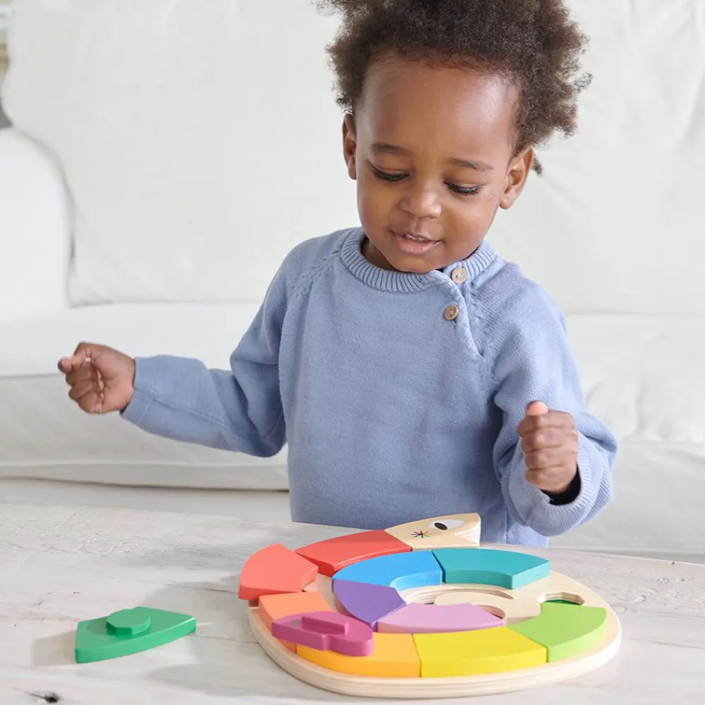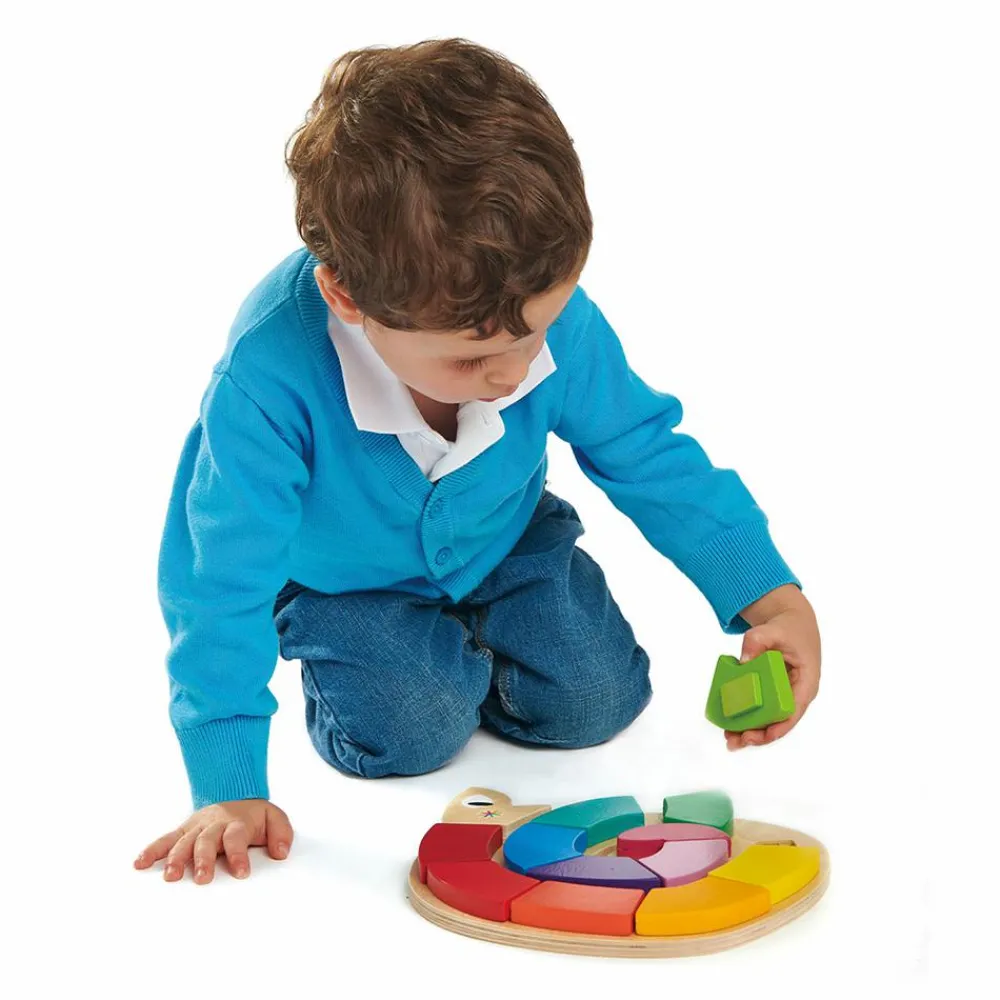 De mange farver på dette træpuslespil fra Tender Leaf Toys appellerer til dit barns nysgerrighed, og I kan tale om, hvilke farver, der kommer efter hinanden på slangens krop.